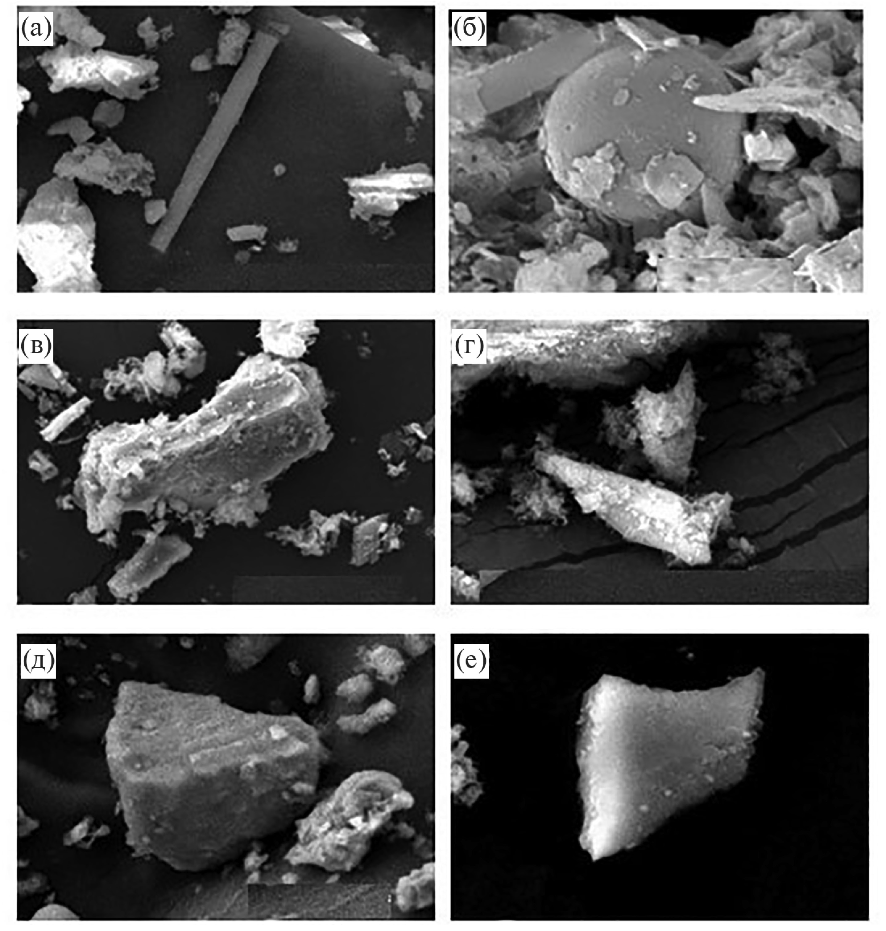 Рис. 4. Разнообразие встреченных морфотипов фитолитов: (а) ELONGATE ENTIRE; (б) SPHEROIDAL; (в) BLOCKY REСTANGULAR; (г) ACUTE BULBOSUS; (д) BULLIFORM FLABELLATE; (е) RONDEL CONICAL. Размеры фитолитов на фотографиях варьируют от 2 до 10 μm.