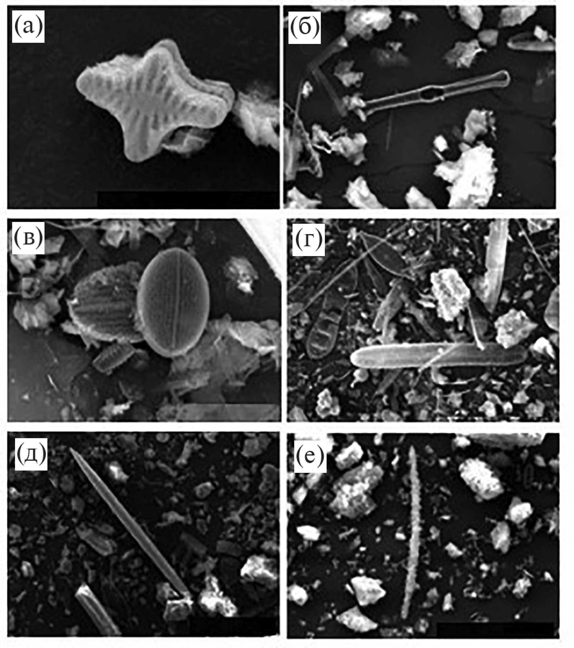 Рис. 5. Разнообразие морфотипов: (а)–(г) диатомовых водорослей; (д), (е) спикул губок. Размеры объектов 5–10 μm.