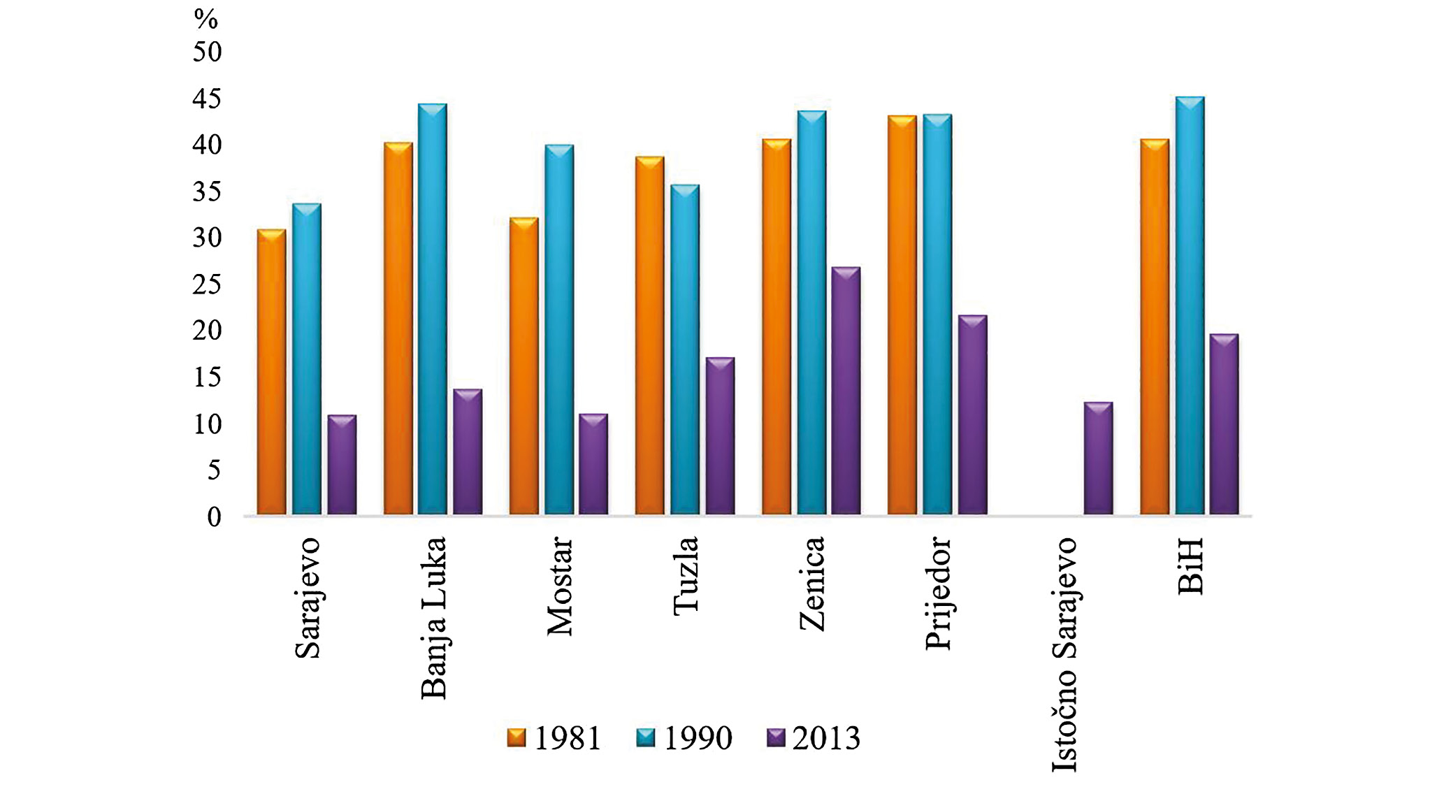 Demographic, political and cultural processes in the 20th century (birth rates, migrations, national awareness, opinions on Communism and religion, the idea of the Bosnian and Yugoslav nation) affected changes in ethnic and confessional groups. The share of Serbs and Croats in the total population is decreasing (Tab. 1). The Islamized population, different in ethnicity (Serbian Muslims, Croatian Muslims), declared themselves as Serbs or Croats of the Islamic confession, ethnic Muslims, Yugoslavs, and since the 1990s they have been called Bosniaks. The attempt to form a unique identity through the creation of the Yugoslav nation lasted until the 1990s, when it lost popularity in the atmosphere of strengthening national identities. The creation of a “Bosnian nation” among Bosniaks at the beginning of the 21st century is a revived idea from the Austro-Hungarian period. Under conditions of industrialization and urbanization in a socialist society, cultural integration in big cities takes place at an accelerated pace. Housing policy has contributed to the erasure of ethnic boundaries. All major cities have a heterogeneous ethnic structure at the time of the Census 1981. The share of Yugoslavs generally ranges from 10–17% (Tab. 1). The process of disintegration of the SFRY influenced the change of the national consciousness as confirmed by the Census 1991, when the proportion of Yugoslavs decreased (5.5%) and the proportion of ethnic Muslims increased. According to the 2013 Census, the share of Yugoslavs together with 20 minority ethnic groups was only (2.04%). Their decline symbolizes the disappearance of common cultural values and identity. Changes in the ethnic declaration of the three most numerous peoples are a consequence of the strengthening of individual national and cultural identities in the process of political disintegration of the SFRY. The education system of post-Dayton B&H is divided into three separate systems under the influence of history and culture of its ethnic groups. The language has three official names and two alphabets: Serbian (Cyrillic), Croatian and Bosnian (Latin) separated only by few linguistic variants. Bosniaks emphasize the Islamic elements of culture as the primary cultural determinant of B&H (Mandić, 2018). The influence of religious institutions in society is increasing. Religious education is a compulsory subject in all primary and secondary schools and strengthens confessional identities.