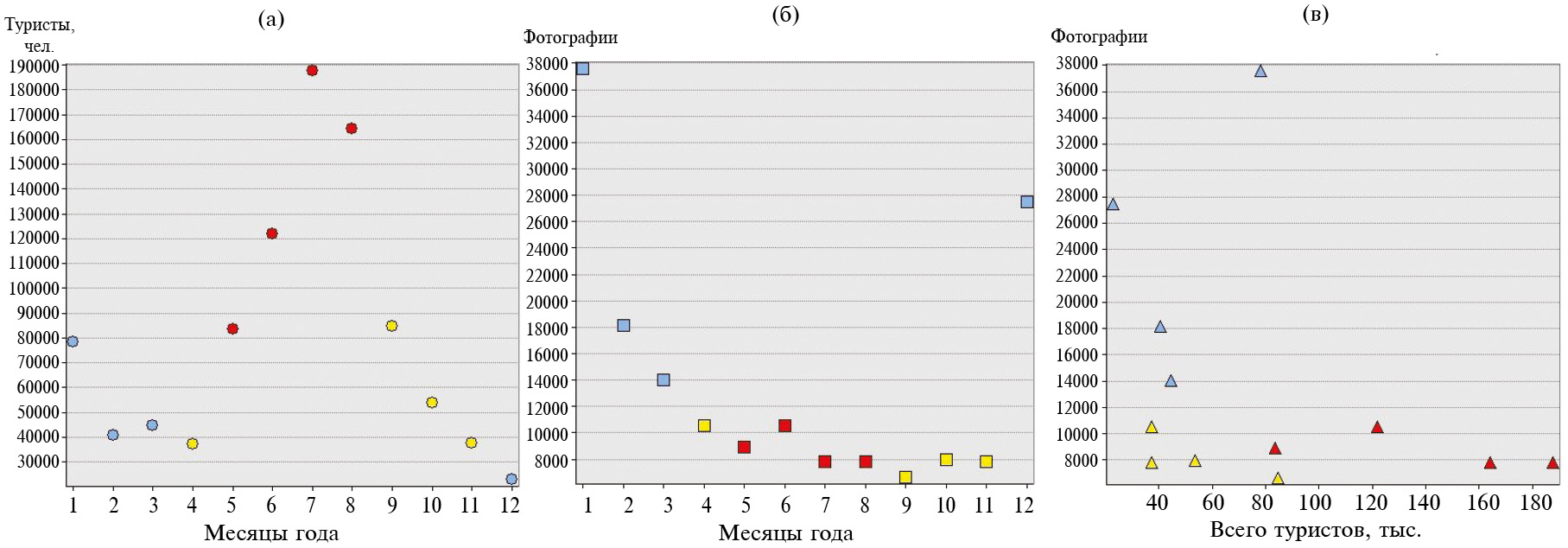Рис. 1. Пример сравнения данных на графиках для Республики Карелии: а) распределение туристов по месяцам согласно данным СберАналитики, б) распределение фото по месяцам, в) зависимость числа сделанных фотографий от числа туристов (значение коэффициента детерминации R2 10.3%); синие значки – зимние месяцы, красные значки – летние месяцы, желтые значки – демисезон (весна – осень).