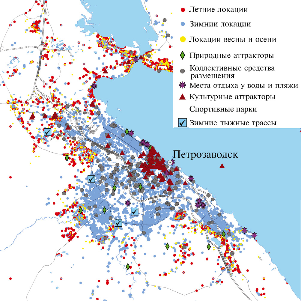 Специфические сезонные паттерны возникают в окрестностях Москвы и Санкт-Петербурга и на периферии областных центров. Так, в окрестностях Санкт-Петербурга существуют круглогодично нагруженные ареалы, приуроченные к скоплениям КСР в живописных пригородах с парками, а также к летним трассам сплава по порожистым сплавным рекам. В Республике Карелия, в окрестностях Петрозаводска, ареалы нагрузки приурочены, в том числе, к пляжам Онежского озера и точкам зимней рыбалки вдоль берега и в акватории озера (рис. 2).