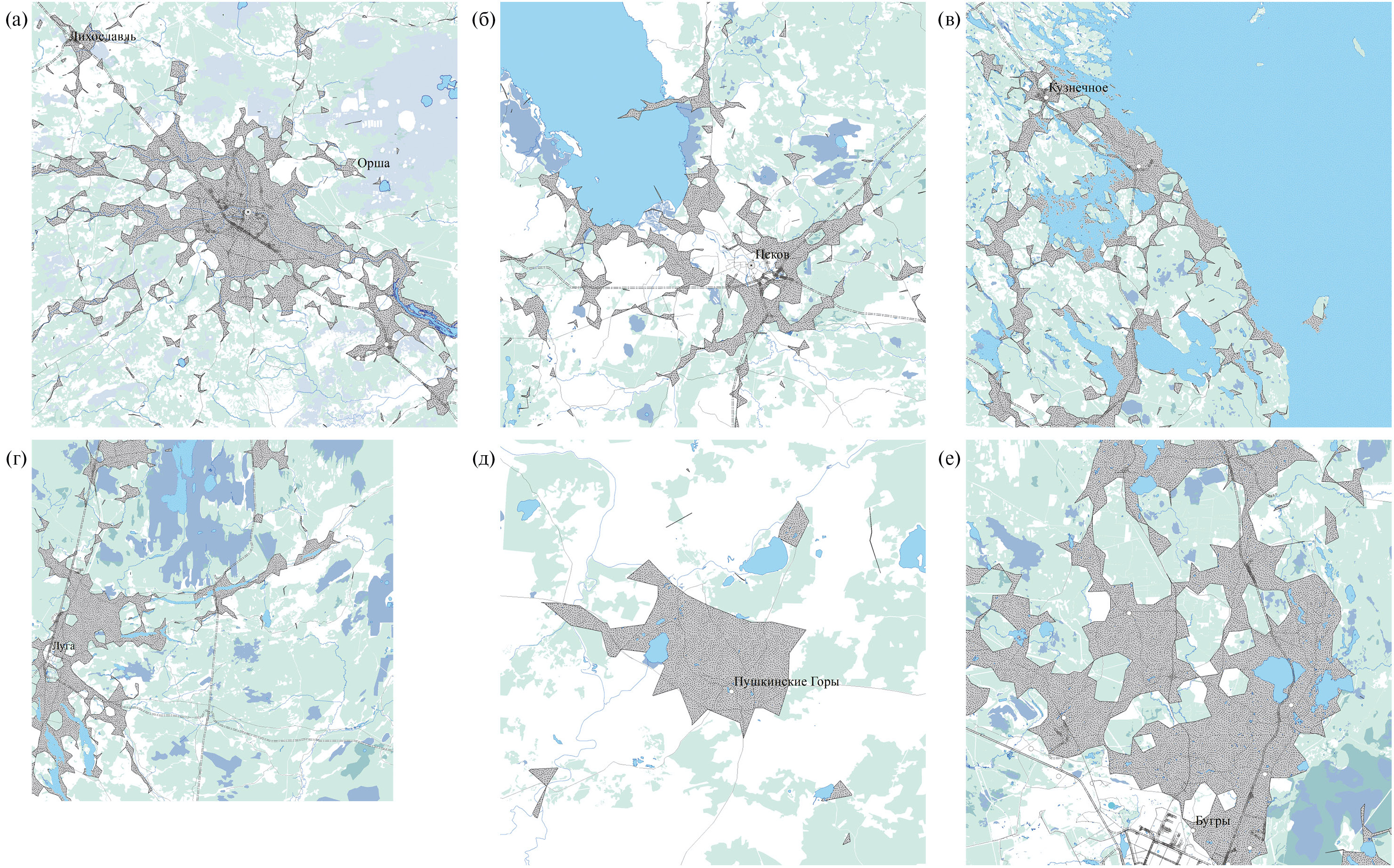 Рис. 3. Некоторые типы сезонных паттернов и соответствующих им туристско-рекреационных местностей в пределах макрорегиона: (а) летний вокруг областного центра – Твери; (б) летний, прибрежного отдыха на Чудском озере; (в) летний приозерный на шхерных берегах Ладоги в окрестностях Кузнечного, Ленинградская область; (г) летний, с речным маршрутом Оредежское Кольцо в окрестностях Луги; (д) зимний вокруг музея-заповедника “Михайловское” в окрестностях Пушкинских гор; (е) зимний с горнолыжными трассами и рыбалкой в окрестностях Парголово, Ленинградская область.