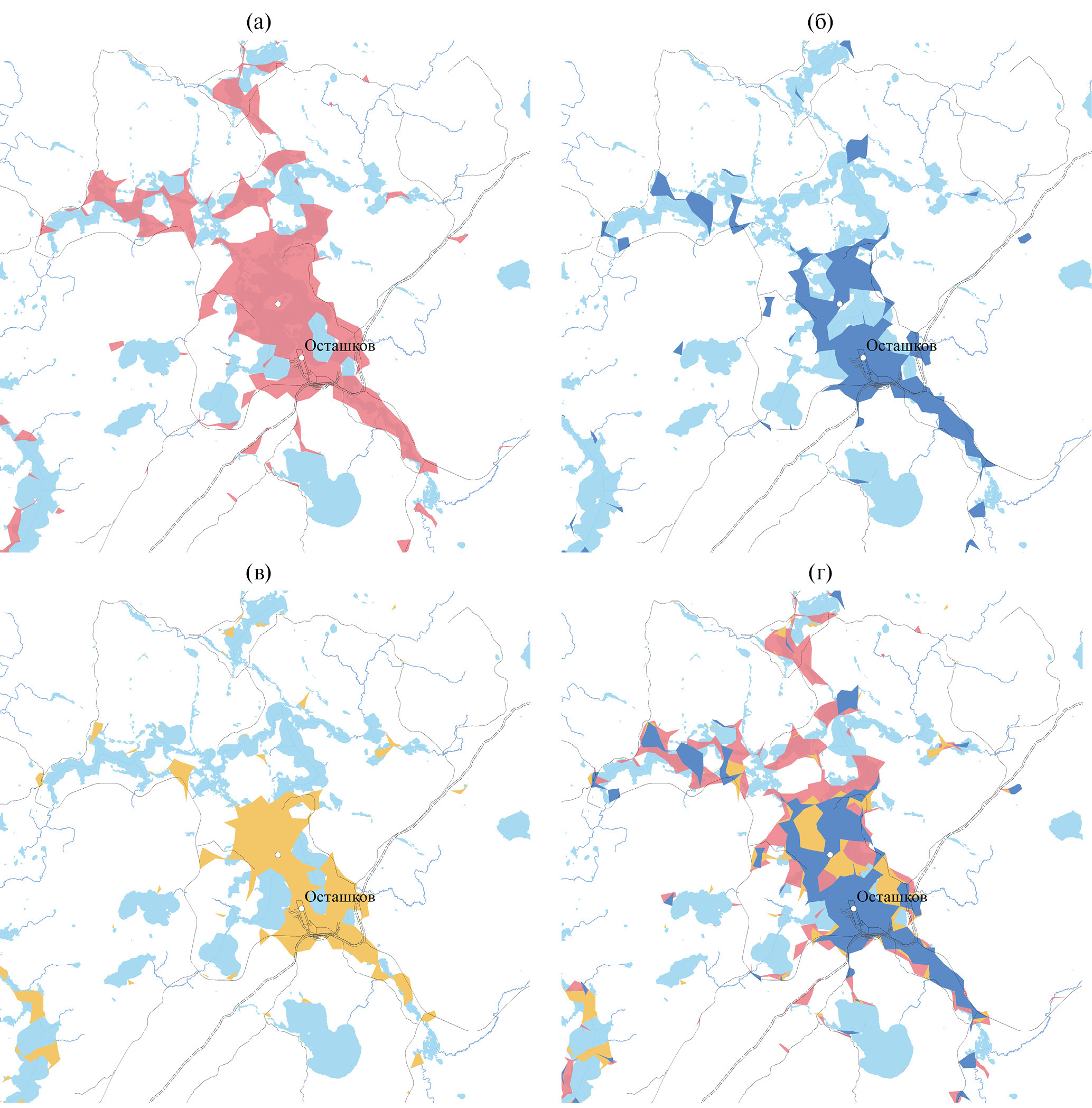 Рис. 4. Сезонные ареалы присутствия в окрестностях Осташкова, Тверская область: (а) летние, (б) зимние, (в) демисезонные, (г) наложение трех ареалов.
