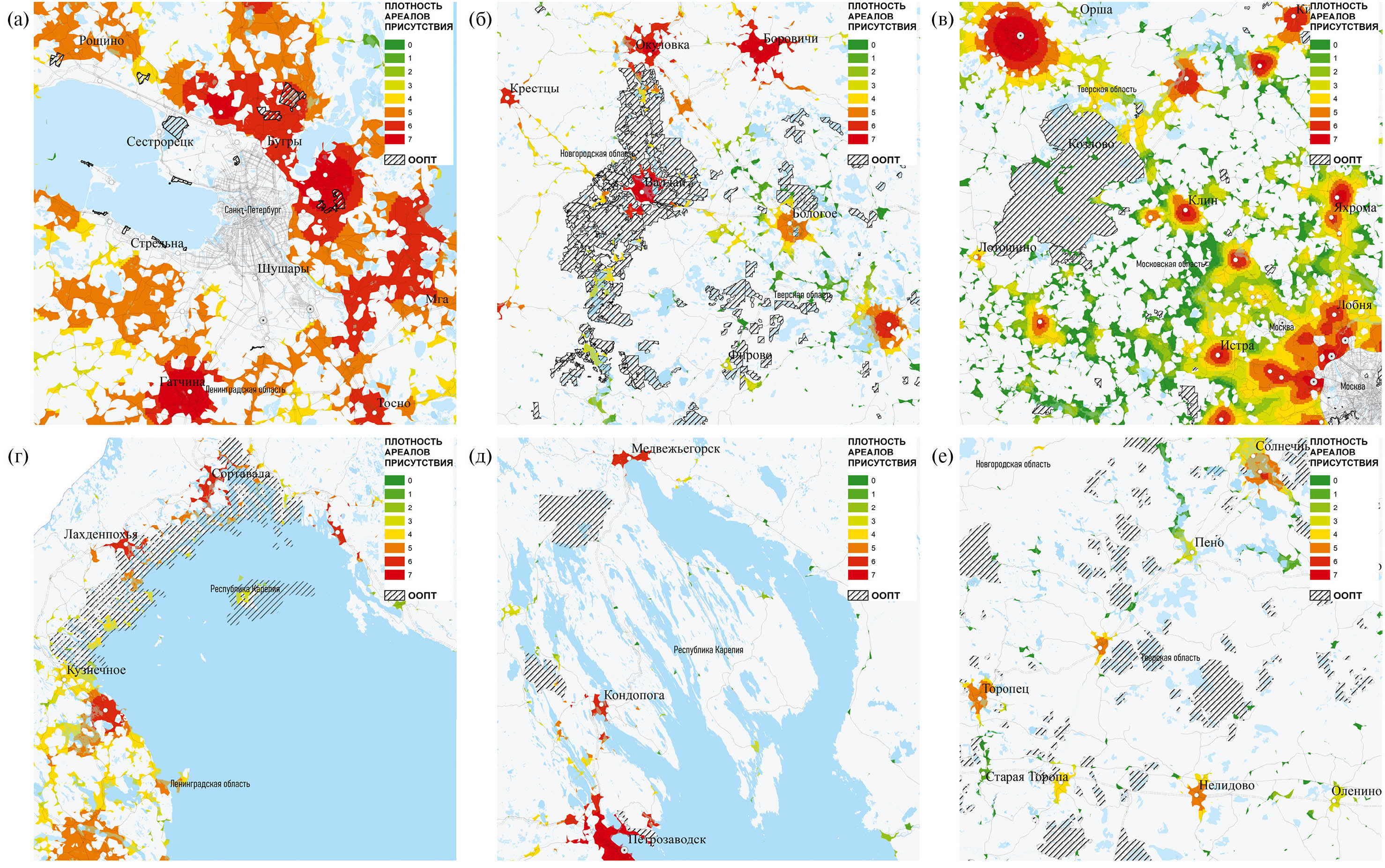 Рис. 5. Типичные варианты соотношения ареалов присутствия туристов и рекреантов и ООПТ: (а) окрестности Санкт-Петербурга; (б) Валдайский национальный парк на границе Новгородской и Тверской областей; (в) Национальный парк “Завидово” на оси между Москвой и Тверью; (г) “Ладожские шхеры”, Республика Карелия; (д) северо-западное побережье Онежского озера, (е) “провинциальная” территория с ООПТ между Андреаполем и Нелидово, Тверская область. Плотность ареалов присутствия оценена по 7 классам, соответствующим интервалам абсолютных значений (способ разбиения “естественные границы”).