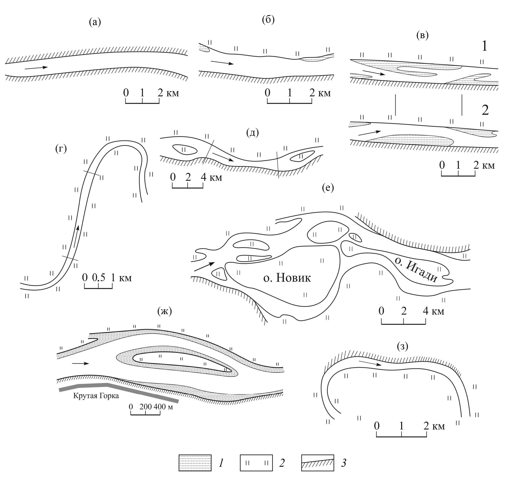 Рис. 1. Основные разновидности прямолинейных неразветвленных русел: (а) врезанное русло (р. Ангара, выше слияния с Енисеем); (б) широкопойменное русло вдоль коренного берега (плесовое) (р. Северная Двина, ниже устья р. Вычегды); (в) широкопойменное перекатное русло (р. Хуанхэ), 1, 2 – с изменением положения побочней при смещении перекатов; (г) “вставка” между смежными излучинами (средний Иртыш, ниже устья р. Тары); (д) между островами одиночных разветвлений (нижняя Обь, выше с. Перегрёбное); (е) в рукавах пойменно-русловых разветвлений (нижняя Печора); (ж) рукава руслового (островного) разветвления (р. Иртыш, ниже Омска); (з) на сундучной излучине вдоль коренного берега (средний Иртыш, выше устья Тобола). 1 – прирусловая отмель, 2 – пойма, 3 – коренной берег.