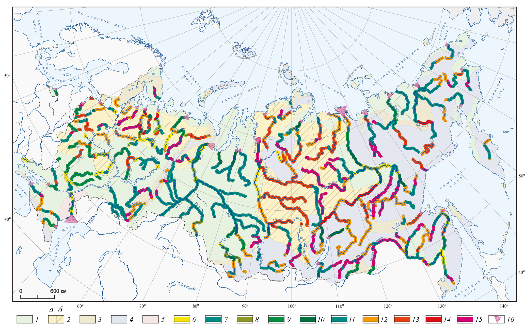 Рис. 2. Карта распространения прямолинейных неразветвленных русел на реках России. Районы распространения на малых и средних реках: 1 – равнинные реки с широкопойменным и адаптированным руслом, в основном меандрирующие, но с участками разной протяженности прямолинейных русел; 2 – равнинные реки с врезанным руслом (врезанные излучины, чередующиеся с участками прямолинейного русла): а – в пластичных грунтах, б – в скальных грунтах; 3 – горные реки с развитыми аллювиальными формами и полугорные с разбросанными и сложно разветвленными руслами во внутри- и межгорных котловинах в предгорных зонах; 4 – горные реки с врезанным руслом (порожисто-водопадные, с неразвитыми аллювиальными формами, селевые); 5 – территории с отсутствием речной сети. Большие и крупнейшие реки. Широкопойменные русла: 6 – прямолинейные неразветвленные русла; 7 – прямолинейные русла между одиночными разветвлениями, образующими морфологически однородные участки; 8 – прямолинейные русла основных рукавов в односторонних и двусторонних разветвлениях; 9 – прямолинейные участки (“вставки”) между излучинами и разветвлениями; 10 – прямолинейные рукава в русловых островных разветвлениях; 11 – единичные, эпизодически встречающиеся фрагменты прямолинейного русла на меандрирующих и разветвленных реках. Врезанные русла: 12 – прямолинейные неразветвленные; 13 – прямолинейные участки между врезанными излучинами и разветвлениями; 14 – прямолинейные рукава в разветвленных руслах; 15 – единичные фрагменты прямолинейного русла среди врезанных излучин и разветвлений; 16 – прямолинейные рукава в дельтовых разветвлениях.