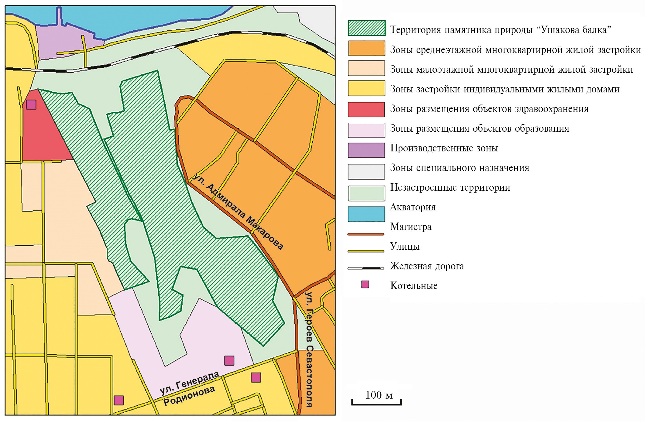 Ближайшими к “Ушаковой балке” стационарными источниками загрязнения являются 4 котельные: одна непосредственно вблизи северо-западной границы ООПТ, две в 50 м и одна в 180 м юго-западнее 19. Транспортные источники загрязнения: юго-восточная граница “Ушаковой балки” непосредственно примыкает к оживленной трассе (Ул. Героев Севастополя), северная – к железной дороге, восточная идет вдоль улицы Адмирала Макарова (рис. 2). Преобладающие направления ветров, а также близость к акватории улучшает состояние атмосферного воздуха.