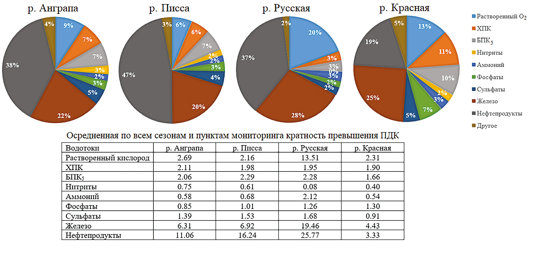 Качество речных вод закономерно ухудшается от верховьев к устьевым частям в связи с увеличением аккумуляции реками стоков с сельскохозяйственных угодий, населенных пунктов и индивидуальных домохозяйств. Показатели ИЗВ и качество вод изучаемых рек изменяются: в бассейне р. Анграпы от 2.95 до 6.31 (классы качества вод: загрязненные–грязные–очень грязные), в бассейне р. Писсы от 2.46 до 8.89 (классы качества вод: загрязненные–очень грязные), в бассейне р. Красной от 1.82 до 3.17 (классы качества вод: умеренно загрязненные–грязные), в бассейне р. Русской от 4.94 до 15.93 (классы качества вод: грязные–очень грязные–чрезвычайно грязные). Наибольший вклад в значения ИЗВ вносят кислородные показатели и, особенно, высокие концентрации железа и нефтепродуктов, повышенные концентрации сульфатов, в меньшей степени биогенные элементы: фосфаты и аммоний (рис. 5).