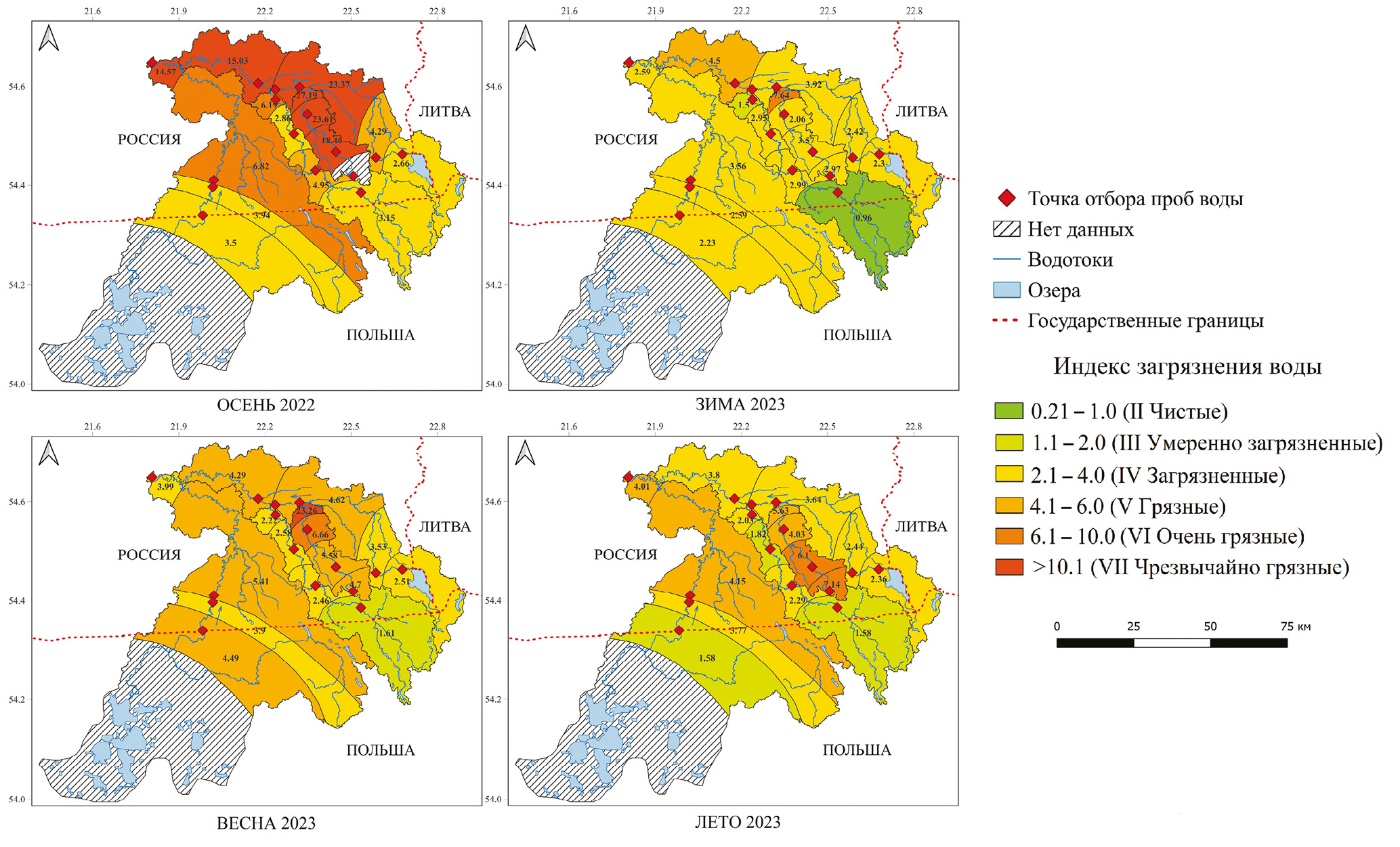 Рис. 6. Динамика загрязнения речных вод по четырем гидрологическим сезонам в бассейне р. Анграпы за 2022–2023 гг.