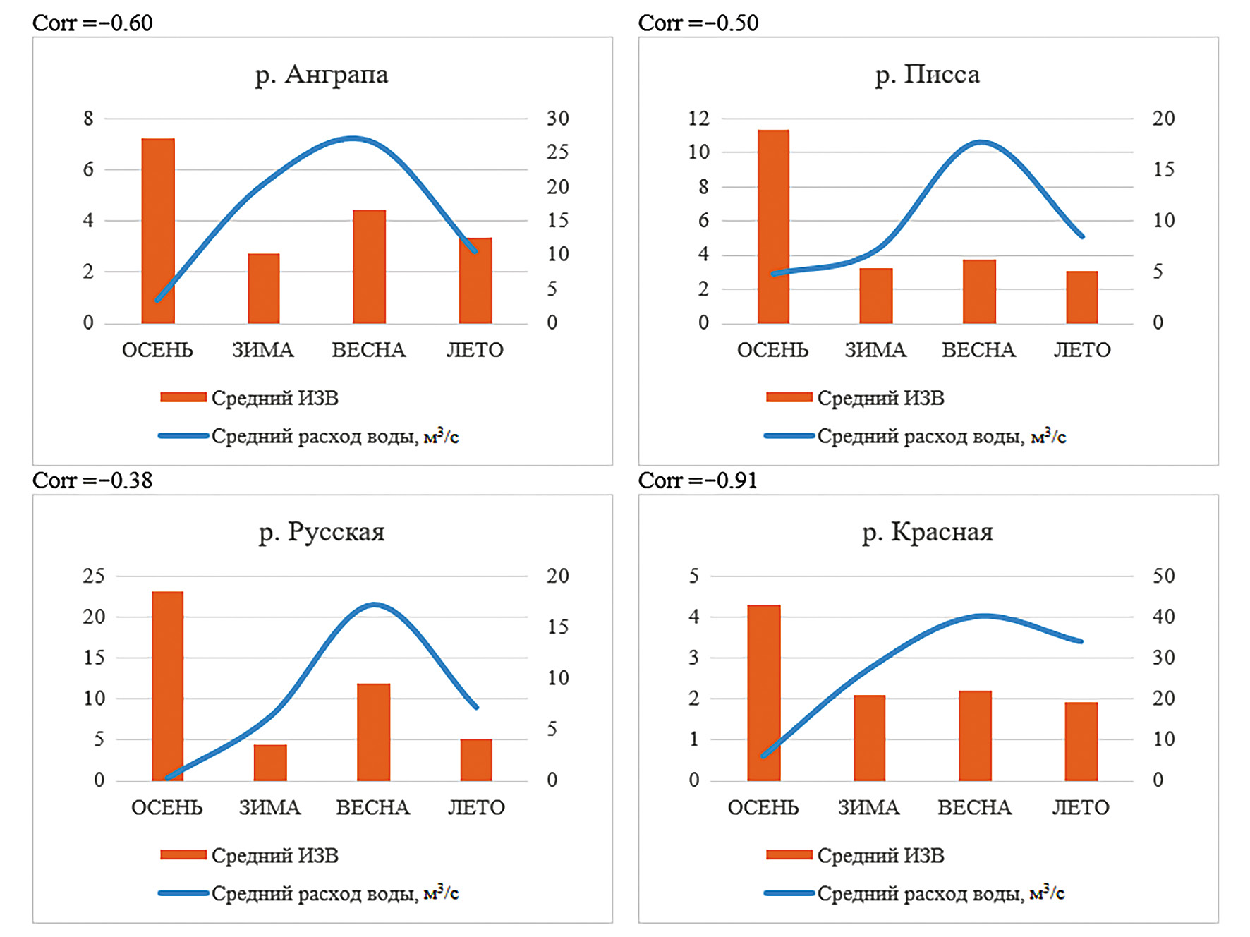 Временная изменчивость загрязнения рек в районе исследования в значительной мере определяется водностью гидрологических сезонов, на которую влияют климатические особенности Калининградской области. Результаты исследований рек Калининградской области показывают, что характеристики стока сильно влияют на концентрации вещества в речных водах (Зотов и др., 2021). Поскольку исследование опирается на произведенные нами разовые измерения расходов воды в каждом из рассматриваемых сезонов, а более точных данных в открытом доступе пока не появилось, мы оперируем водностью как таковой, с точки зрения разбавления концентраций химических веществ. Ее привязка к тем или иным фазам водного режима пока гипотетическая из-за недостаточности данных наблюдений. Влияние характеристик стока исследуемых рек на значения ИЗВ показано на рис. 7.