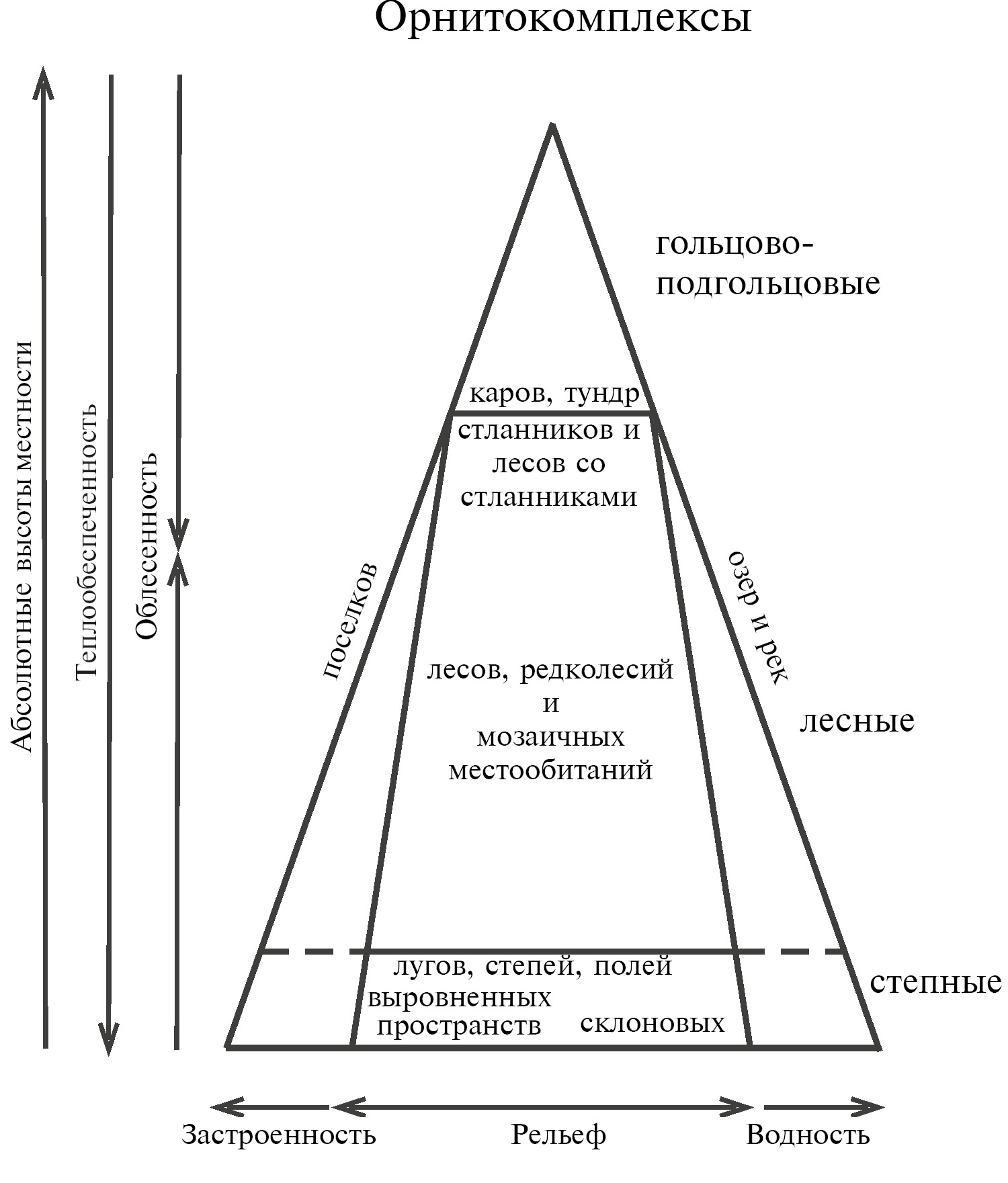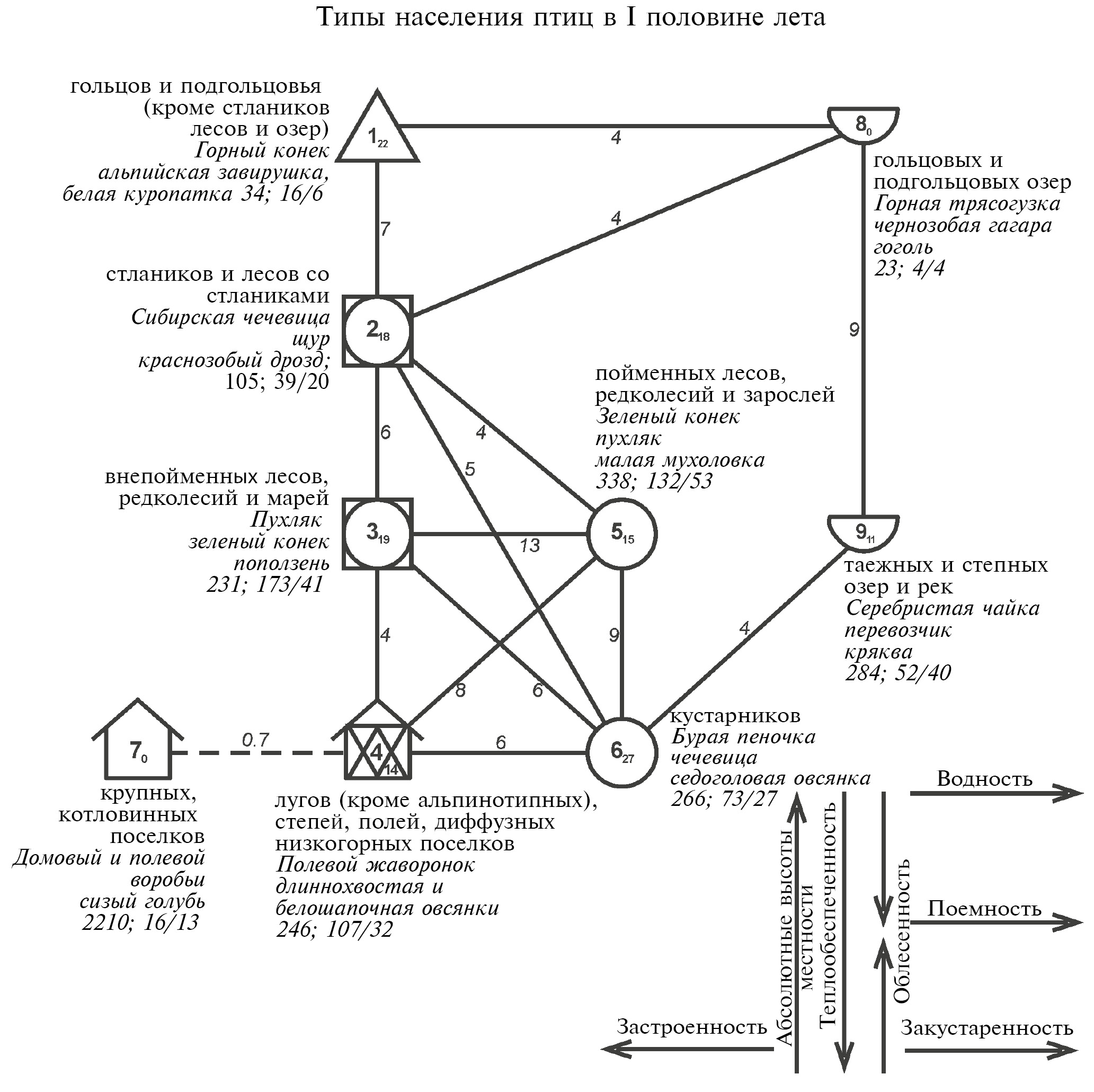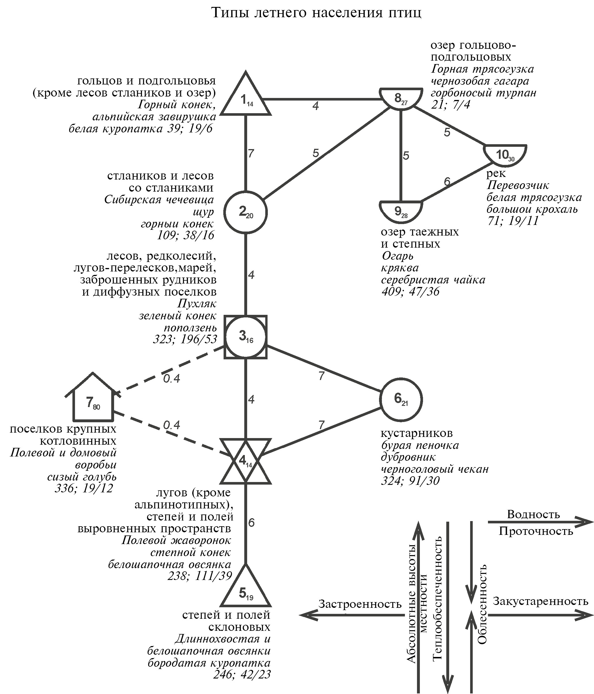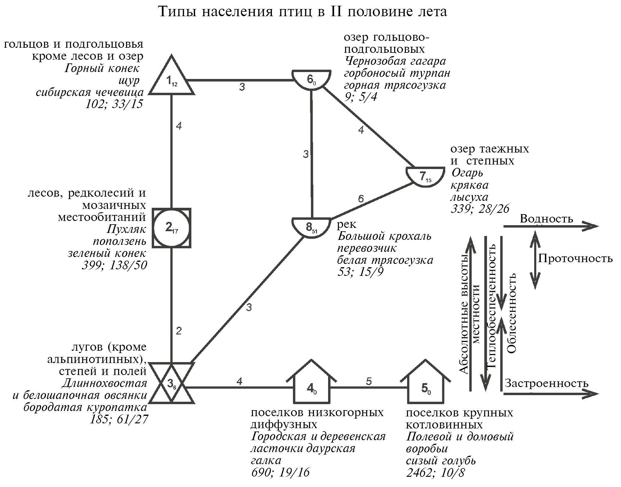 Рис. 6. Обобщенная пространственно-типологическая структура и организация неоднородности летнего населения птиц Хэнтэй-Чикойского нагорья.
