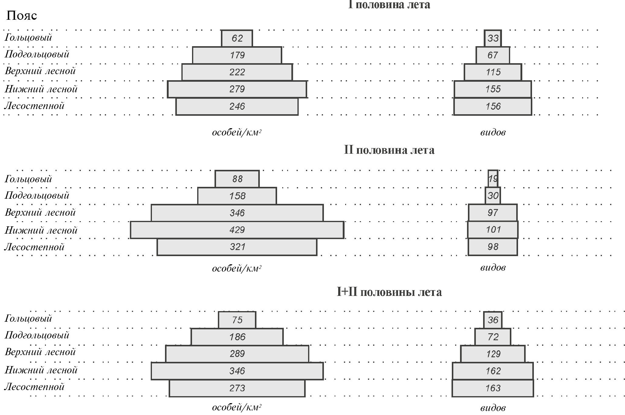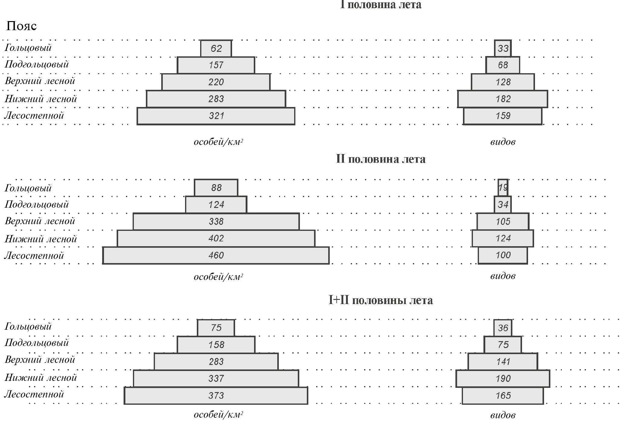 В пространственной организации населения птиц в целом по I и II половинам лета особо значимы высотная поясность, облесенность, абсолютные высоты местности и, в меньшей степени, водность, проточность и закустаренность. Сезонные отличия в пределах лета малозначимы (табл. 1). Все факторы среды по половинам лета учитывают 35 и 44% дисперсии матриц сходства, а классификационные и структурные режимы, как неразделимые сочетания факторов так же, как вместе с относительно простыми факторами – 52 и 54% неоднородности матриц сходства (в целом за лето – 50%), что соответствуют коэффициентам корреляции 0.72, 0.73 и 0.71. Различия в оценках по I и II половинам лета и в целом за лето невелики (1–2%).