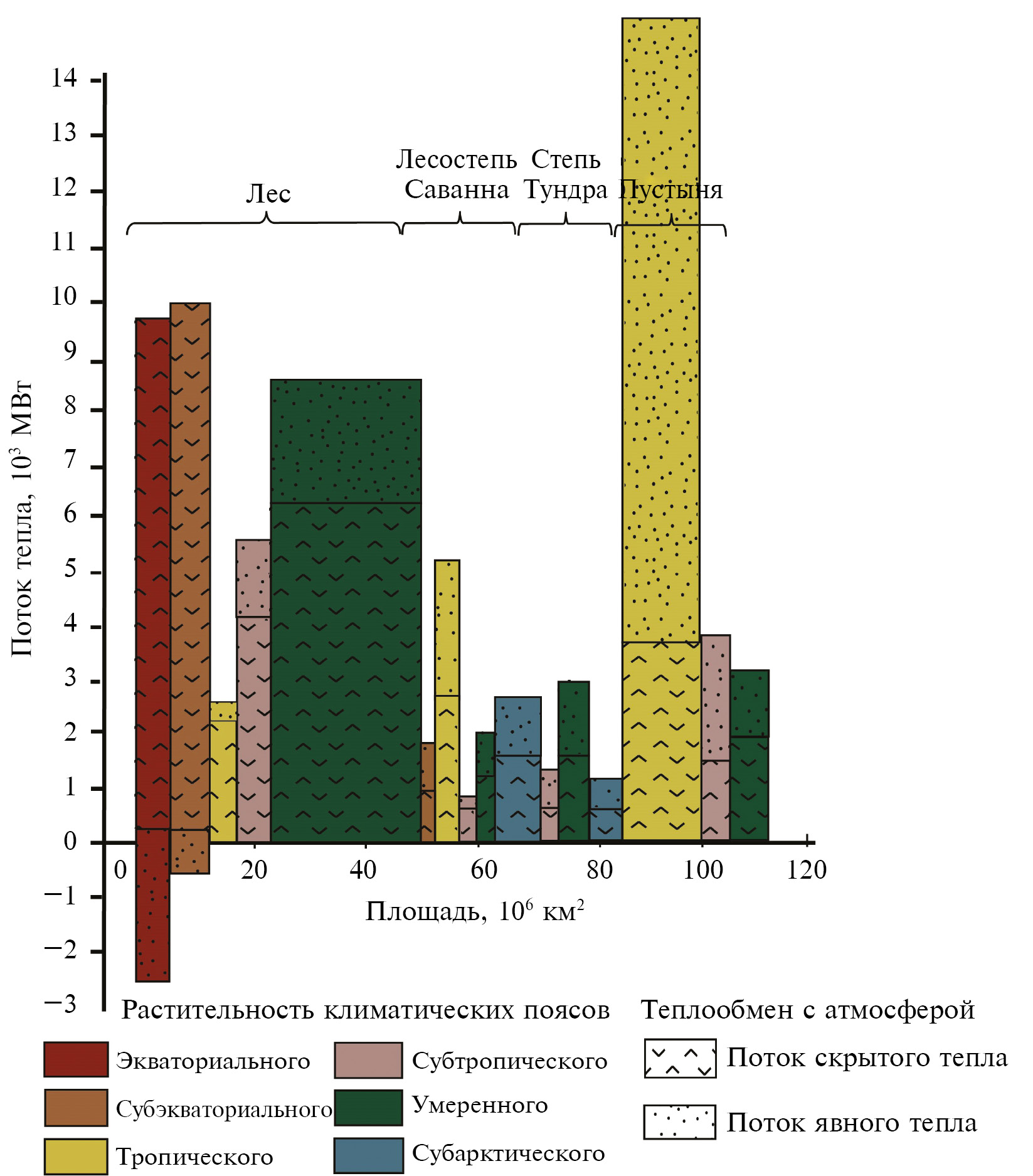 Рис. 1. Потоки скрытого и явного тепла в атмосферу по типам зональной растительности (Котляков, 2001). Климатические пояса (кроме экваториального) представлены на графике разными типами растительности