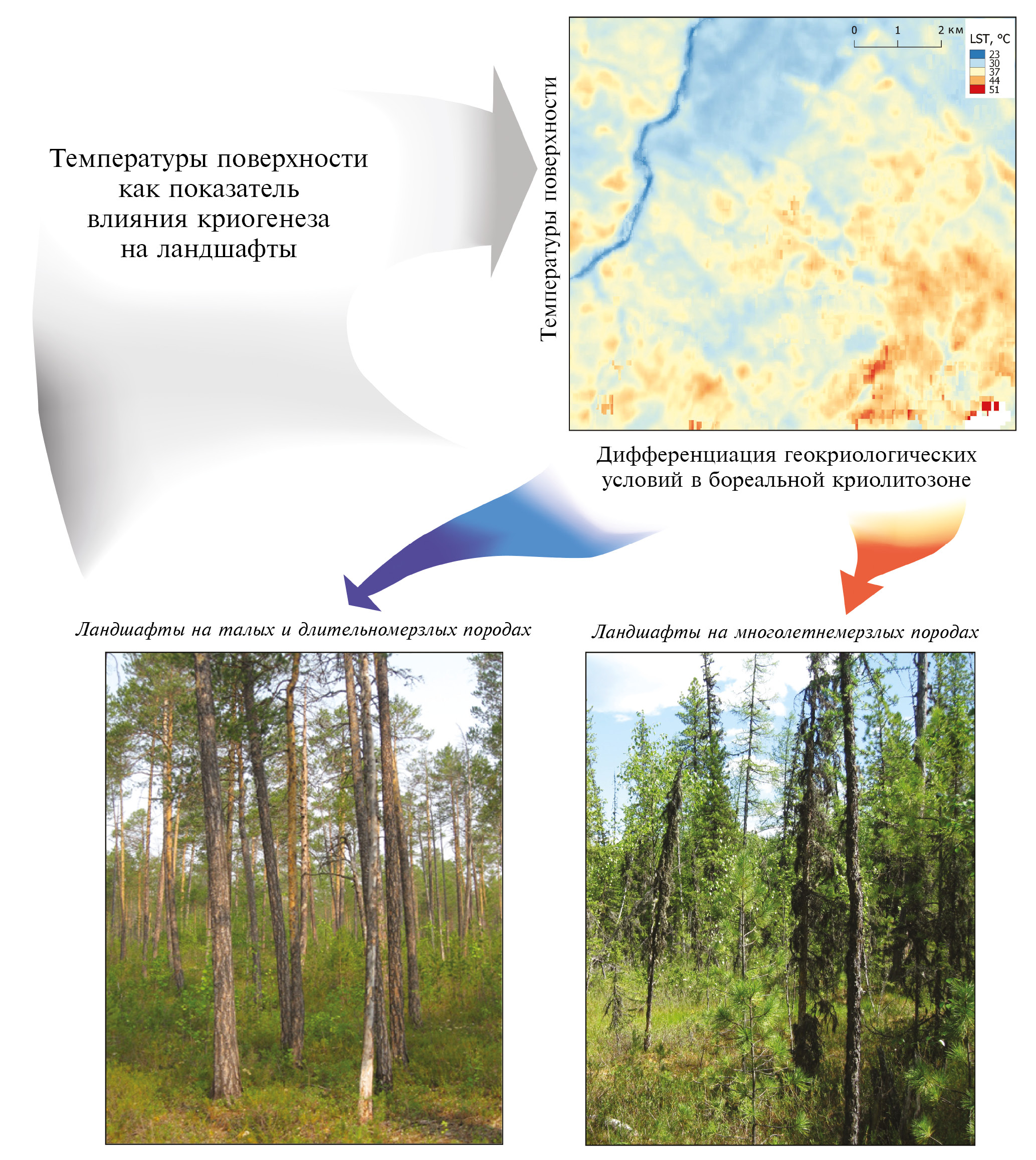 Рис. 2. Особенности тепло- и влагообмена лесных ландшафтов, характеризующихся разной степенью влияния процессов криогенеза на их структуру и функционирование (Medvedkov et al., 2023). Термические характеристики, представленные на тематической карте, индицируют лесные ландшафты с разным потенциалом тепло- и влагообмена в период активной вегетации