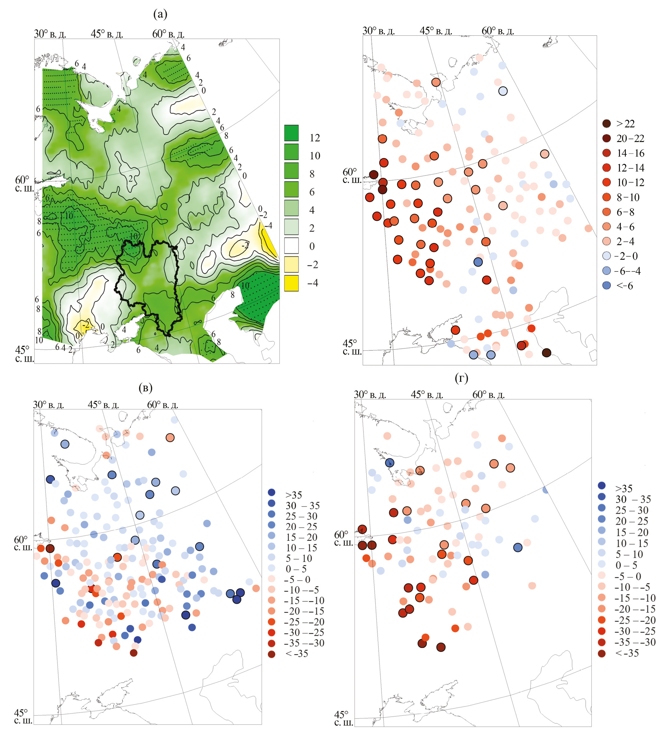 По данным наблюдений за среднесуточной температурой сети метеостанций Росгидромет из архива Всероссийского научно-исследовательского института гидрометеорологической информации – Мирового центра данных (ВНИИГМИ-МЦД)1, были рассчитаны число дней со средней суточной температурой больше 0°C (T >0), в данном исследовании использованное как характеристика зимних оттепелей, а также суммы температур в эти дни за каждый год в период 1961–2020 гг. Доля жидкой фракции осадков, важных для понимания гидрологических изменений, в общем их количестве в среднем за месяц анализировалась по данным наблюдений за суточными осадками из того же архива ВНИИГМИ-МЦД. При расчете сумм жидких осадков использовался критерий отнесения осадков к жидкой их фракции при среднесуточной температуре воздуха >1°C. При анализе суточных данных в расчет принимались временные ряды данных на метеостанциях, содержащие не более 10% пропущенных лет за изучаемый период.