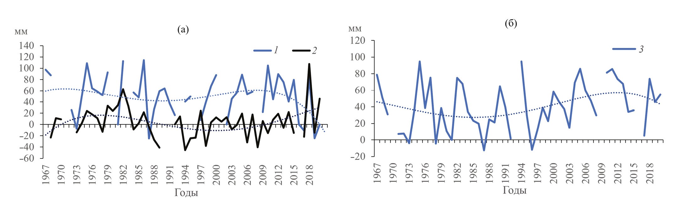 Рис. 4. Многолетняя изменчивость разности суммарных осадков за декабрь–январь и запасов воды в снеге в период 1967–2020 гг., измеренных в поле в окрестностях метеостанций Калач (1) на первую пентаду февраля и Павелец (2) на первую декаду февраля (а), а также в лесу в окрестностях метеостанции Валуйки (3) на первую декаду февраля (б). На рис. 4а и б одиннадцатилетние скользящие средние показаны полужирными линиями, полиномиальные тренды 4-й степени – пунктирными линиями