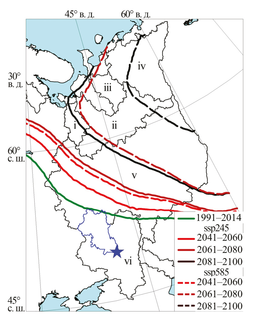 Рис. 5. Пространственное распределение изолинии числа дней с положительной температурой воздуха в январе со значением, равным пяти дням, в среднем за периоды 1991–2014, 2041–2060, 2061–2080 и 2081–2100 гг. в бассейнах рр. Онега (i), Северная Двина (ii), Мезень (iii), Печора (iv), Волга (v), Дон (vi) согласно данным ансамбля климатических моделей проекта CMIP6. Бассейн Дона обведен линией синего цвета, гидрологический пост Казанская отображен звездочкой