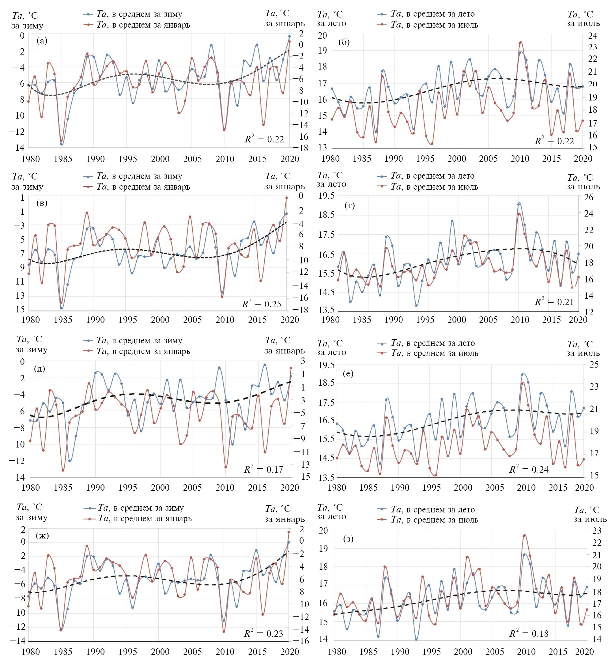 Рис. 3. Многолетняя изменчивость температур воздуха на севере (г. Выборг), востоке (г. Тихвин), западе (г. Кингисепп) и юге (дер. Николаевское Лужского района) Ленинградской области: температура воздуха в среднем за зиму, за январь в Выборге (а), Тихвине (в), Кингисеппе (д) и Николаевском (ж) и в среднем за лето, за июль в Выборге (б), Тихвине (г), Кингисеппе (е) и Николаевском (з). Пунктирной линией показан полиномиальный тренд по пятилетиям. Ta – температура воздуха, °С