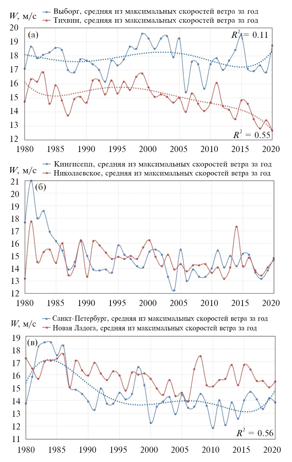 Рис. 4. Многолетняя изменчивость средних за год максимальных месячных значений скоростей ветра (W, м/с): (а) Выборг и Тихвин; (б) Кингисепп и дер. Николаевское; (в) Санкт-Петербург и Новая Ладога. Пунктирными линиями показаны полиномиальные тренды по пятилетиям
