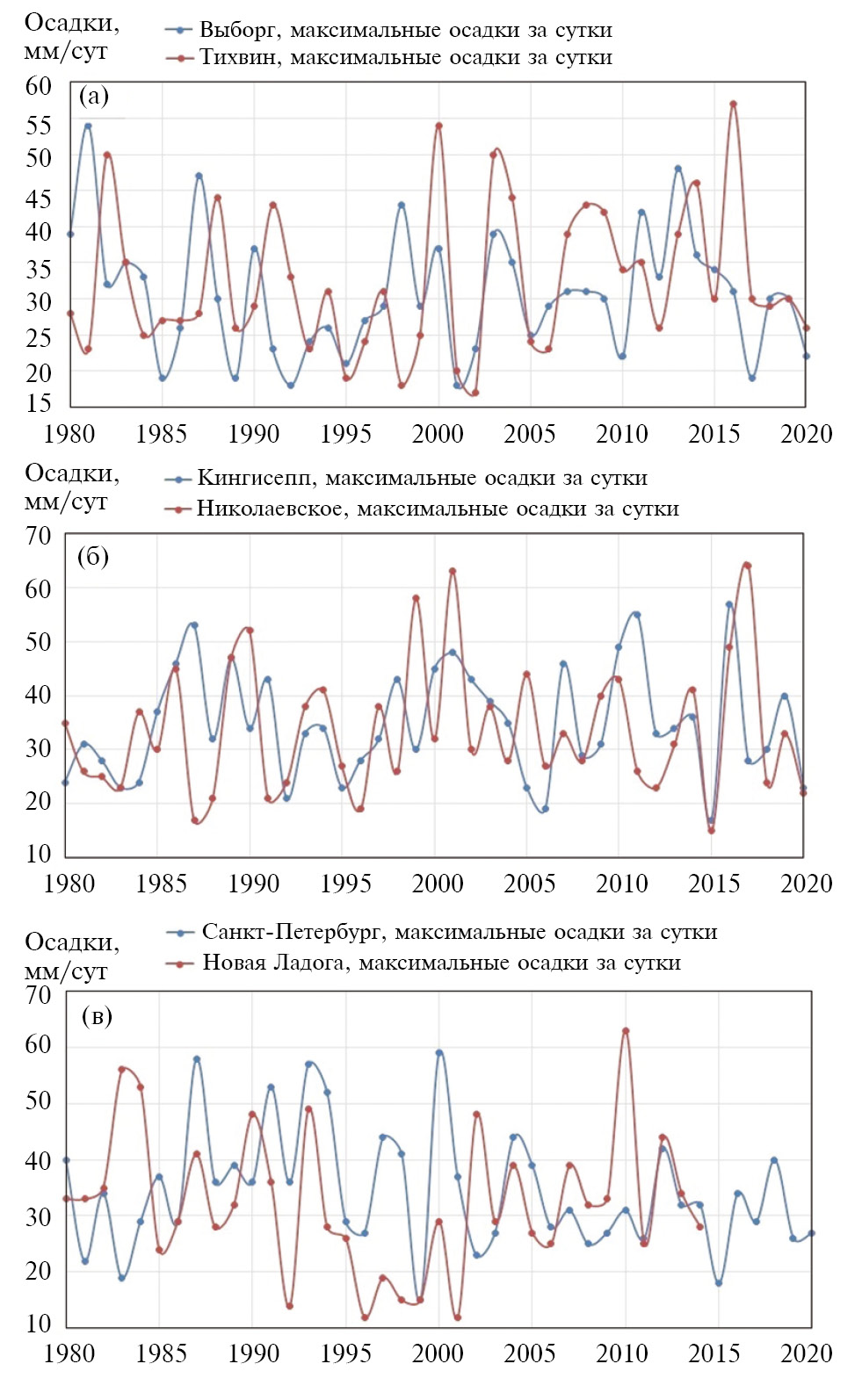 На рис. 5 представлена многолетняя изменчивость величин максимальных атмосферных осадков за 1 сутки в месяц в среднем за год. Значения атмосферных осадков демонстрируют значительную межгодовую изменчивость на всех анализируемых станциях. Весьма значительные (более 50 мм) величины атмосферных осадков, выпадающие за 1 сутки, способные привести к неблагоприятным последствиям, причем внезапным, были зарегистрированы в Выборге (54 мм, август 1981 г.), Кингисеппе (55 мм, июль 2011 г.; 57 мм, август 2016 г.), Санкт-Петербурге (53 мм, август 1991 г.; 57 мм, июль 1993 г.; 59 мм, июль 2000 г.), Тихвине (54 мм, июль 2000 г.; 67 мм, июль 1967 г.); Новой Ладоге (56 мм, август 1983 г.; 53 мм, август 1984 г.; 63 мм, август 2016 г.), дер. Николаевское (58 мм, июль 1999 г.; 63 мм, июль 2001 г.).