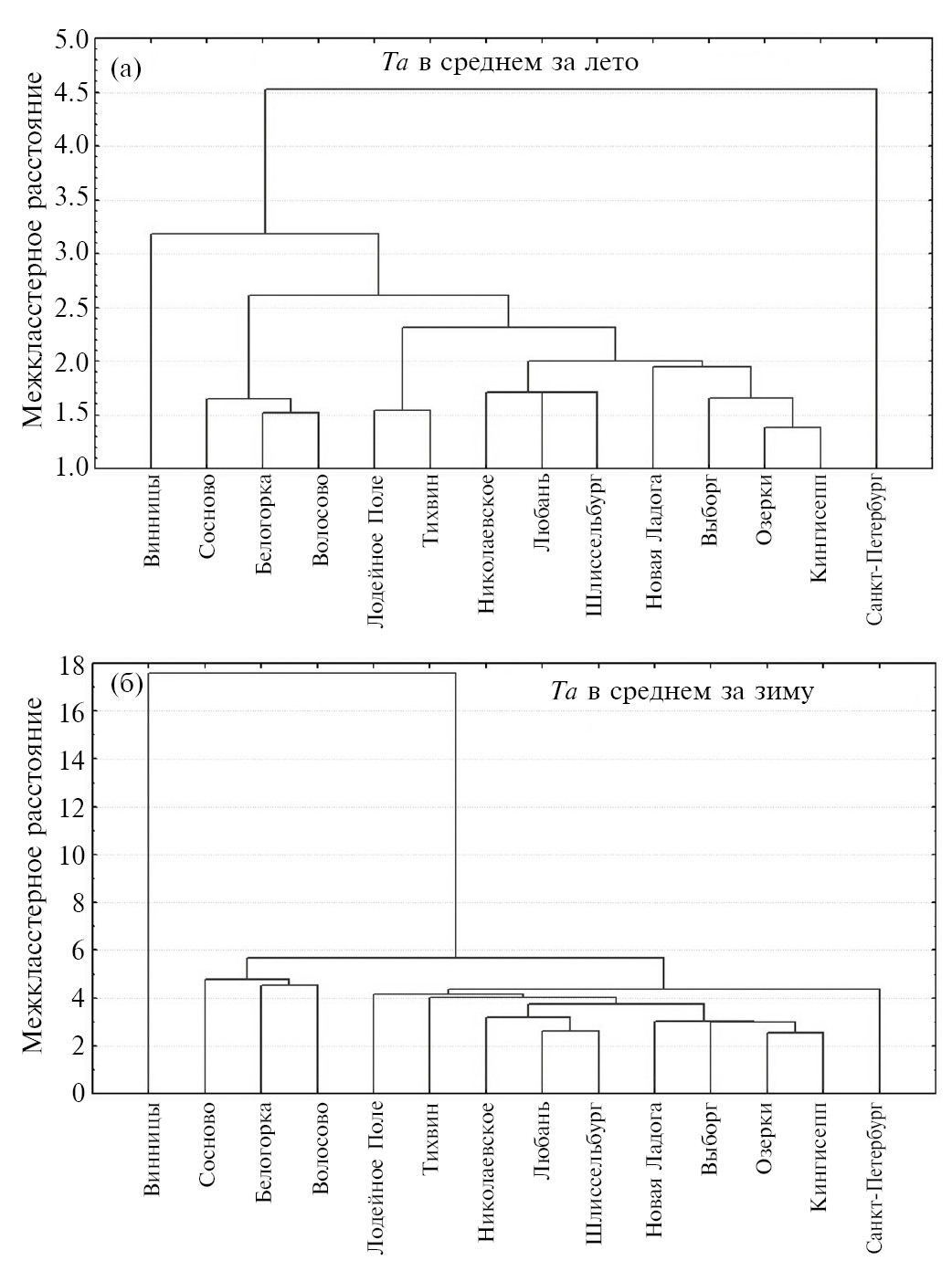 Рис. 6. Результаты кластерного анализа многолетних данных (1980–2020 гг.) средних годовых значений температур воздуха за лето (а) и зиму (б) в Ленинградской области и в Санкт-Петербурге
