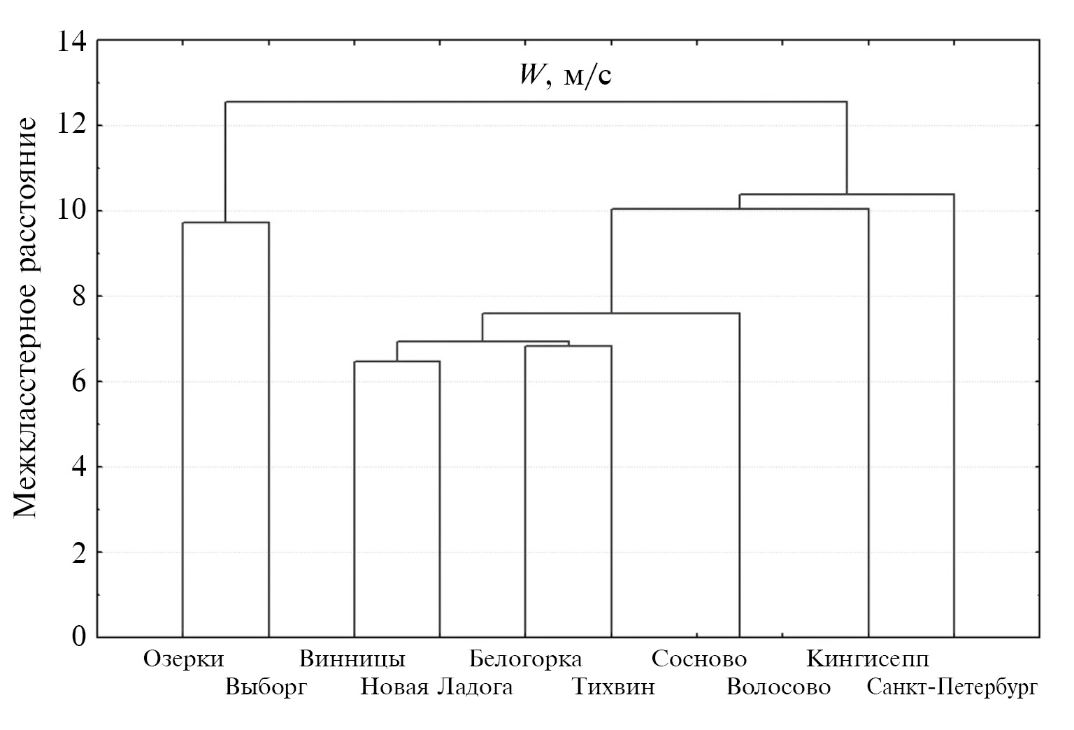 Рис. 7. Результаты кластерного анализа многолетних данных (1980–2020 гг.) средних за год максимальных месячных значений скорости ветра в Ленинградской области и в Санкт-Петербурге