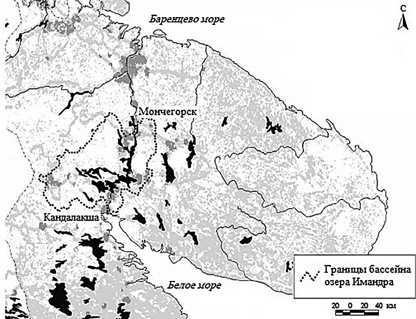 Бассейн оз. Имандра является наиболее хозяйственно-освоенной территорией Мурманской области. Площадь бассейна составляет около 12 тыс. км2 (рис. 2). Социоприродная система территории формировалась в результате развития промышленного, селитебного, транспортного, лесохозяйственного и природоохранного видов природопользования. Хозяйственное освоение происходит в условиях северо-таежных ландшафтов цокольной равнины, испытывающей высокую степень техногенной нагрузки, связанной с механическими нарушениями природных геосистем, а также их деградацией вследствие поступления аэротехногенных поллютантов (соединений серы и азота, тяжелых металлов, пылевых частиц и др.). Так, объем выбросов в атмосферу от стационарных источников в Мончегорске превышает 20 тыс. т/год, В водах оз. Имандра у Мончегорска среднегодовое содержание меди достигает 10ПДК, никеля – 12ПДК, аммонийного азота – 30ПДК, доля проб почв селитебной зоны, не соответствующих санитарно-гигиеническим нормативам, превышает 55% и т.д. (Доклад …, 2023). Основная доля антропогенной нагрузки формируется Мончегорским горнометаллургическим комбинатом Кольской ГМК.