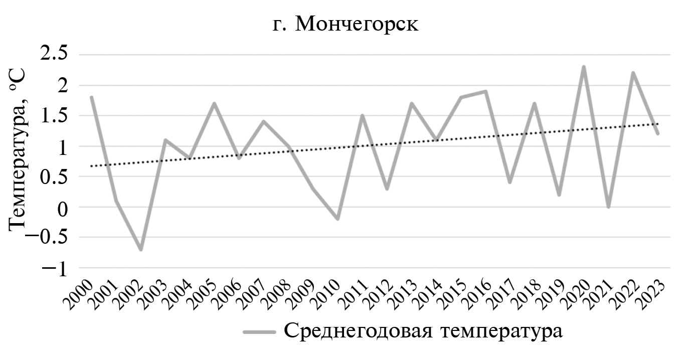Динамические процессы в природном блоке. Натурные наблюдения и анализ тематических научных публикаций позволяет сделать вывод, что в современном цикле развития природного блока основной движущей силой является климатически фактор. Многолетние наблюдения (Второй …, 2014; Доклад …, 2008), свидетельствуют о климатических изменениях на территории с начала 1990-х годов. C 30-х годов XX в. до его последней четверти изменение климатических характеристик было медленным, а затем сменилось современным повышением температур воздуха (в основном за счет зимнего периода). Средняя скорость теплового изменения приземного воздуха в Мурманской области составила 0.6°C за десятилетие, при этом изменение летних температур – 0.6–0.8°C. (Второй …, 2014). Современные среднегодовые температуры уже превышают периоды потеплений 1961–1990 гг. (Демин, 2012). Изменения в количестве осадков менее выражены, однако прогнозируется их увеличение, которое будет заметными к середине XXI в. Более детальные комментарии изменения климата выходят за рамки настоящего исследования, поэтому выделим периоды наиболее значительных колебаний для того, чтобы оценить экологические и социально-экономические процессы, соответствующие им, которые в социоприродной системе территории носят панархический характер. К таким периодам относится начало XXI в., когда, несмотря на значительные колебания, прослеживается рост средних годовых температур воздуха (рис. 4).