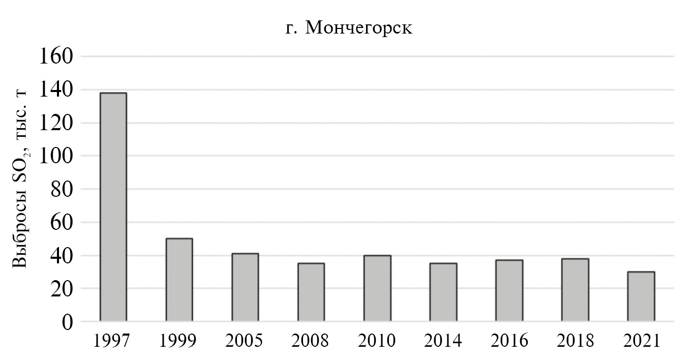 Рис. 6. Уменьшение выбросов диоксида серы, тыс. т/год, Мончегорск (Доклад …, 2021)