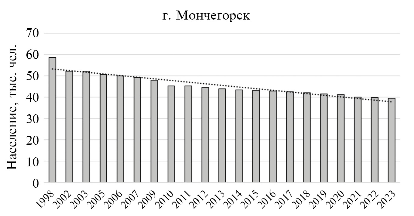Динамические процессы в социальном блоке. Социальные процессы на изучаемой территории в оцениваемый промежуток времени претерпевали существенные трансформации. Перестроечный период в Мурманской области ознаменовался значительным спадом производства, падением жизненного уровня населения, разрушением социальной инфраструктуры. Это привело к миграционной убыли и повышенной смертности населения. Так, с 2000 г. по настоящее время численность населения всей Мурманской области сократилась более чем на 70%. Численность населения продолжает снижаться, хотя темпы сокращения в целом замедлились (рис. 7). В последнее десятилетие (с 2010 по 2022 г.) для городов бассейна оз. Имандра сокращение численности населения составило: Мончегорска – около 9 тыс., Апатитов – 6 тыс., Оленегорска – 3 тыс. человек и т.д., что связано как с миграционными процессами, так и с изменившимися условиями проживания, старением населения. Это негативно сказывается на рынке труда. Об этом может свидетельствовать снижение численности трудоспособного населения за 2000–2020 гг. на 20%.