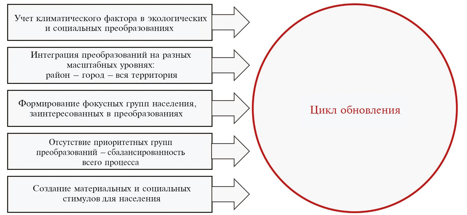 Обновление всей социоприродной системы возможно путем обеспечения комплексности адаптационных мероприятий, стимулирующих сближение перехода/приближения ее отдельных блоков к общему циклу обновления (рис. 9).