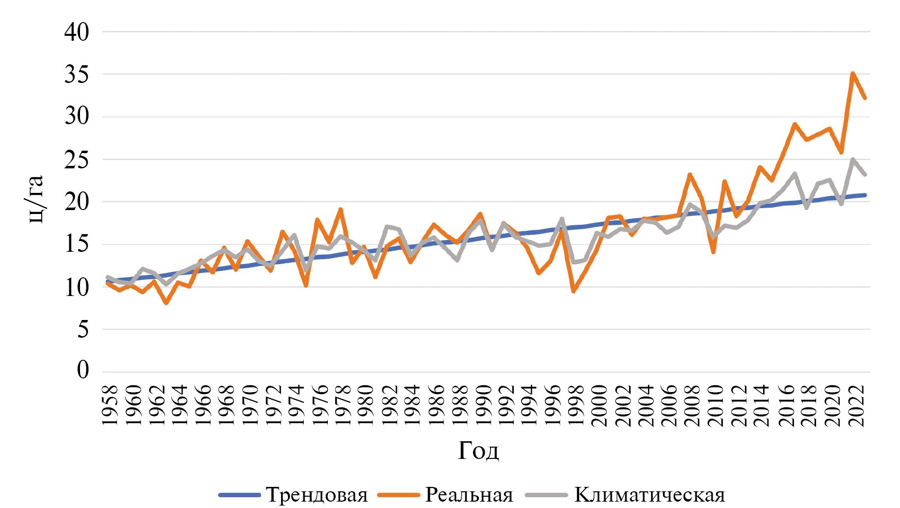 Целью данного исследования была оценка степени соответствия реальной и климатически обусловленной урожайности зерновых в России (и соответственно в РСФСР, если это касается статистики советского периода) на основе регрессионной модели урожайность–погода на период 1958–2020 гг. Наша эмпирико-статистическая модель для периода 1958–2010 гг. показала высокую корреляцию (0.75) между наблюдаемой и климатической (моделируемой) урожайностью зерновых, и в этом отношении недавний период 2000–2010 гг. вполне соответствует паттерну исторической динамики урожайности (Dronin and Kirilenko, 2013). Расширение временного ряда до 2020 г. позволило оценить, насколько современный период рекордных урожаев отличается от других исторических периодов. Кроме того, мы усовершенствовали примененный подход за счет использования трех регрессионных моделей.