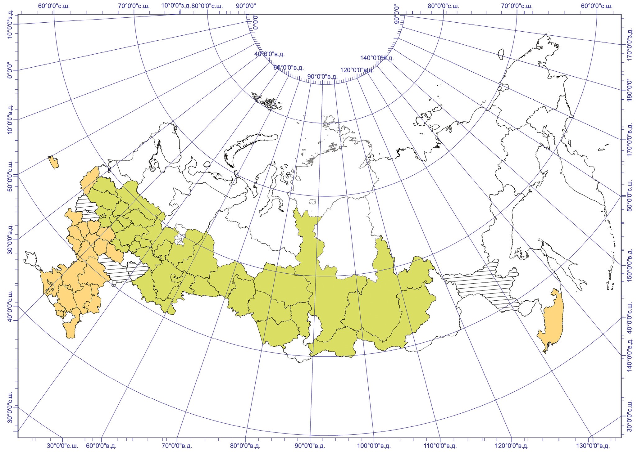 Рис. 2. Группы регионов России по степени дивергенции реальной и климатической урожайности зерновых: оранжевый цвет – регионы, где реальная урожайность заметно превышает климатически обусловленную; зеленый цвет – регионы, где расхождение реальной и климатической урожайности не наблюдается; штриховка – регионы, где превышение реальной урожайности над климатической не является статистически значимым