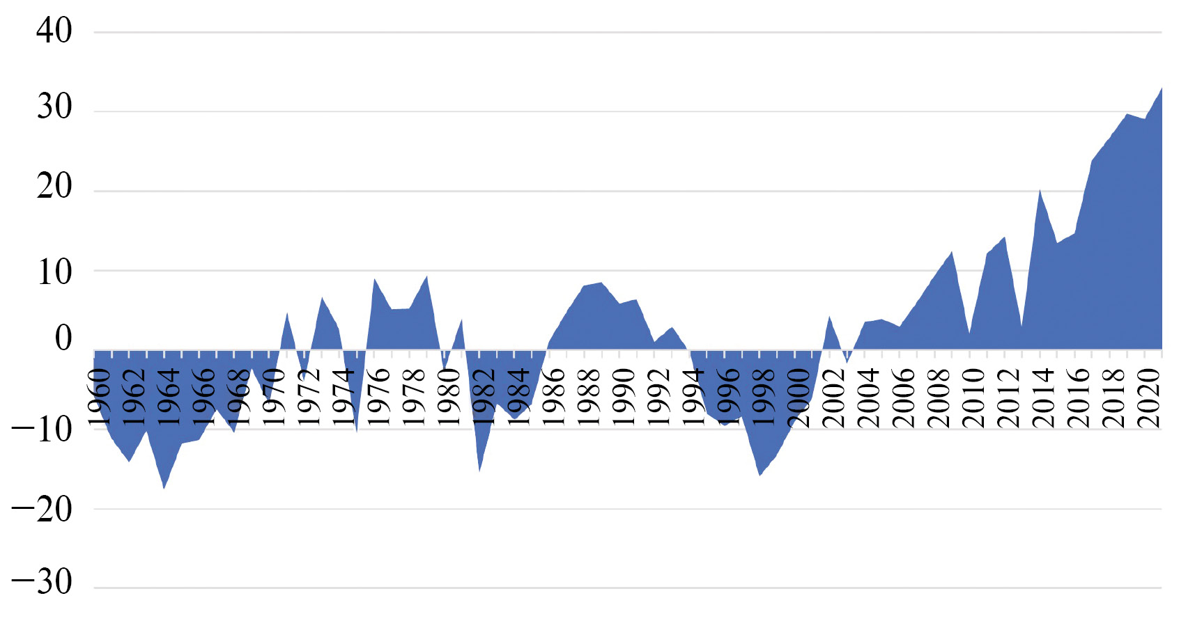 Рис. 3. Отклонение реальной от климатически обусловленной урожайности зерновых в 1958–2020 гг. (трехлетняя скользящая средняя), % от трендовых значений
