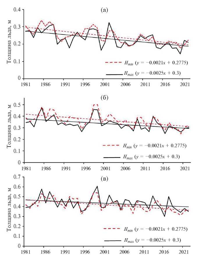 Рис. 4. Рассчитанные тренды толщины льда для минимальных (Hmin) и максимальных (Hmax) глубин в озерах Кольского сегмента Балтийского кристаллического щита (а), прибрежных равнин Баренцева моря (б) и западного склона Уральской горной страны (в)