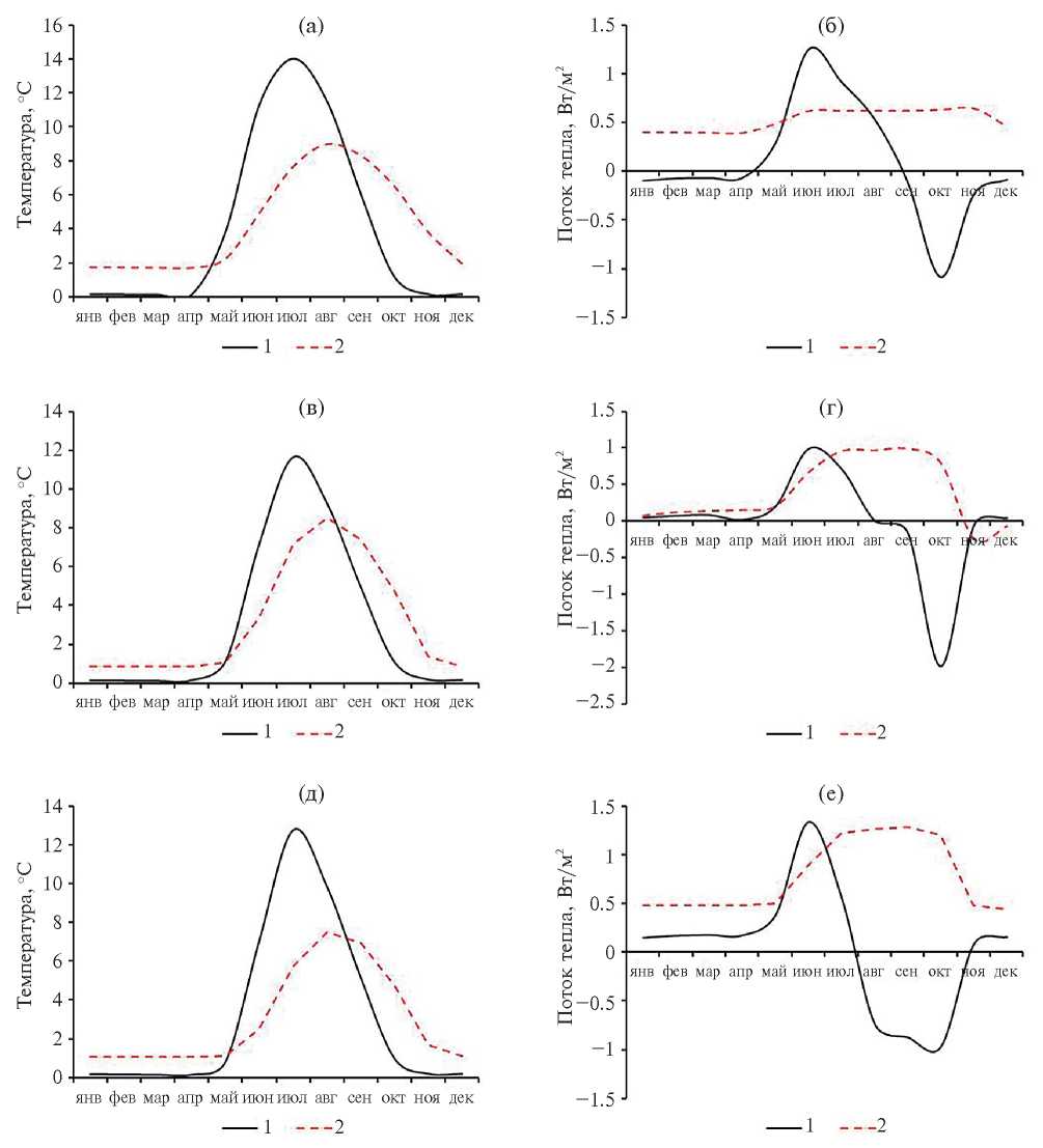 Рис. 5. Рассчитанная внутригодовая динамика средней по глубине температуры воды (а), (в), (д) и потока тепла через границу раздела вода — дно (б), (г), (е) для минимальных (1) и максимальных (2) расчетных глубин в водоемах различных озерных регионов: Кольский сегмент Балтийского кристаллического щита (а), (б); Прибрежные равнины Баренцева моря (в), (г); западный склон Уральской горной страны (д), (е)