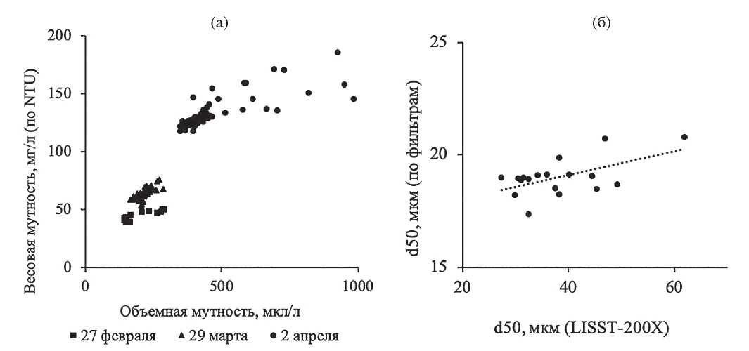 Рис. 1. Результаты сравнения измерений LISST-200X с измерениями весовой мутности (восстановленной по оптической мутности) (а) и среднего диаметра, полученного в пробах лазерным гранулометром Fritsch Analysette 22 (б).