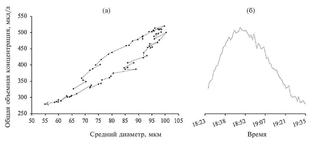 Рис. 2. Связь объемной концентрации взвеси и среднего диаметра частиц (а) и ход общей объемной концентрации (б) во время повышения 19 марта 2024 г. Данные усреднены поминутно