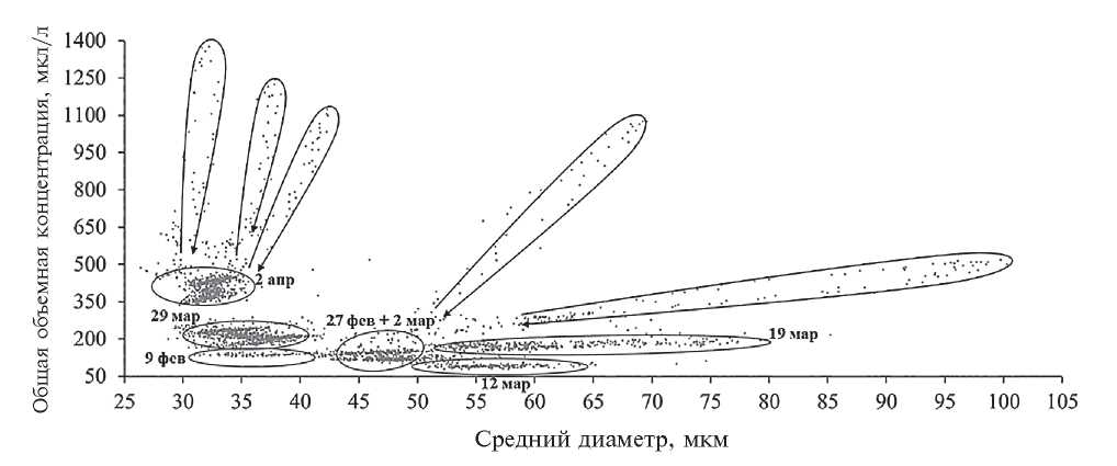 Рис. 3. Связь среднего диаметра и объемной концентрации взвешенных наносов в р. Сетуни, построенная на основе серий экспериментов с лазерным дифрактометром LISST в феврале–апреле 2024 г