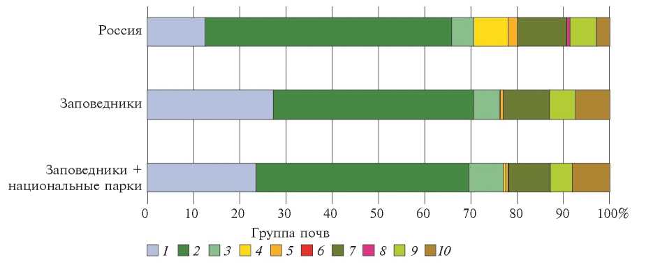 В России 2.6% площади почвенного покрова охраняется в государственных заповедниках и национальных парках. Территориальная охрана почв горных территорий, почв и комплексов почв тундры, почв субтропиков и почв широколиственных лесов и лесостепей — выше среднего уровня по стране. Для почв тайги и хвойно-широколиственных лесов, гидроморфных почв, а также пойменных и маршевых почв относительная площадь, занимаемая ООПТ, немного ниже среднего уровня по стране. Площадная представленность почв степей, сухих степей и полупустынь, засоленных и солонцеватых почв крайне низкая: 0.1–0.7%.