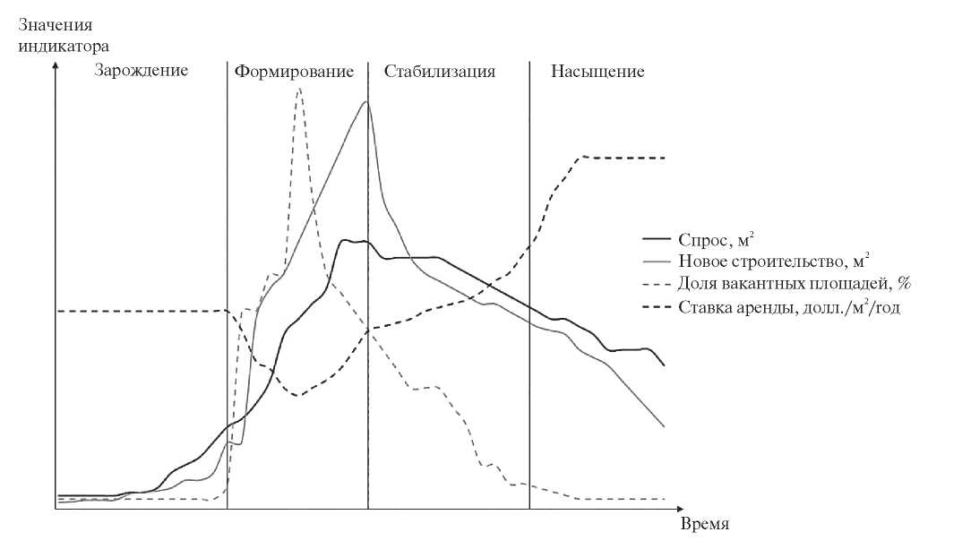 Анализ ранее выполненных исследований и отчетов международных консалтинговых фирм в сфере недвижимости (JLL, Cushman&Wakefield, Knight Frank) на примере крупнейших городских агломераций США (Чикаго, Лос-Анджелес, Нью-Йорк, Атланта, Даллас) и Западной Европы (Лондон, Париж, Рур) позволил выделить этапы развития рынка складской недвижимости в городских агломерациях по динамике ключевых индикаторов (рис. 1). На данном графике важно пересечение кривых спроса и предложения, кривые остальных индикаторов не сопоставимы, более важна их динамика. Этапы развития рынка выделены преимущественно по точкам перегиба кривых.