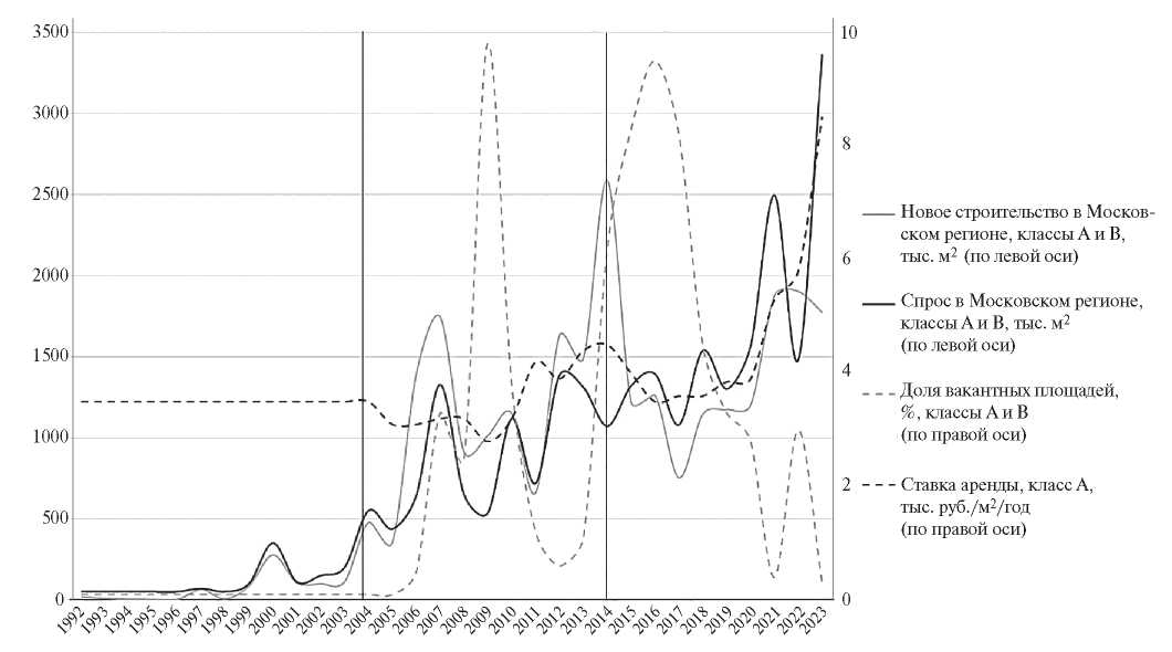 Исследование строится на данных консалтинговых компаний IBC Real Estate, NF Group о складских объектах (существующих на данный момент и строящихся) и сделках со складскими объектами (аренда, продажа) в Москве, Московской области и сопредельных регионах за 1992–2023 гг. Данные за 1992–2002 гг. по спросу, ставкам аренды и доле вакантных площадей восстановлены с использованием экспертных интервью 4 сотрудников консалтинговой компании IBC Real Estate. Для восстановления данных по спросу на складскую недвижимость (табл. 1) за каждый год сопоставлялись сделки, отмеченные разными экспертами, и рассчитывалась максимальная сумма не дублирующихся сделок. По ставкам аренды и доле вакантных площадей цифры от разных экспертов усреднялись. Компания IBC Real Estate с 1997 по 2022 г. работала на российском рынке под международным брендом Jones Lang LaSalle, с 2022 г. выкуплена российским менеджментом, в разные годы занимала 25–50% рынка аренды/продажи складской недвижимости.
