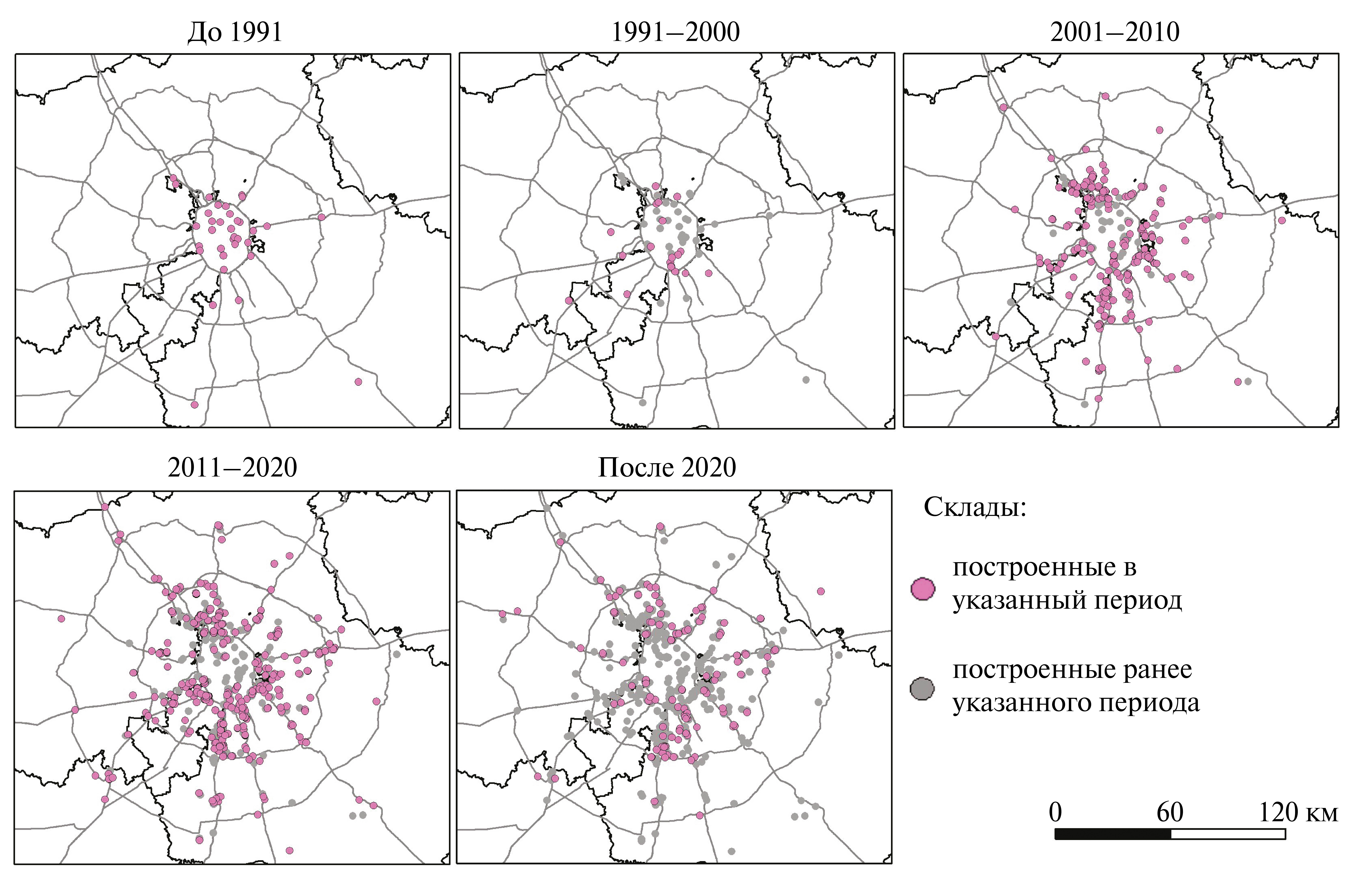 Выделение этапов развития рынка складской недвижимости проводилось на основе статистического анализа показателей (см. табл. 1), границы этапов на графиках отмечены черными линиями, затем определялась территориальная проекция развития сегмента на каждом из этапов с помощью картографического метода. На карту были нанесены складские объекты (1 точка – 1 объект, без учета площади), построенные в Московском регионе по периодам до 1991 г., в 1991–2000 гг., 2001–2010 гг., 2011–2020, после 2020-х годов. Аналогичным образом были сделаны иллюстрации для Московской агломерации с сопредельными регионами, однако период 1991–2000 гг. был объединен с периодом до 1991 г., так как в 1990-е годы не было построено ни одного объекта. Были выделены зоны наибольшей активности нового строительства на разных этапах и составлена схема территориальных сдвигов в развитии рынка складской недвижимости.