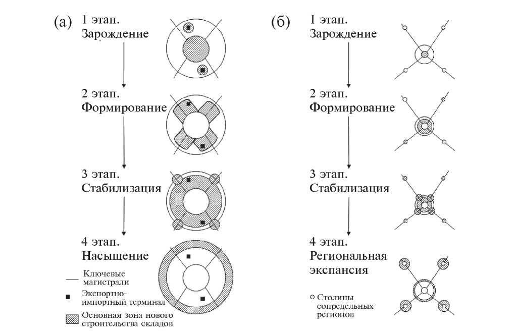 Рис. 4. Схема территориальных сдвигов в развитии рынка складской недвижимости: (а) в границах агломерации; (б) с сопредельными территориями. Составлено автором.