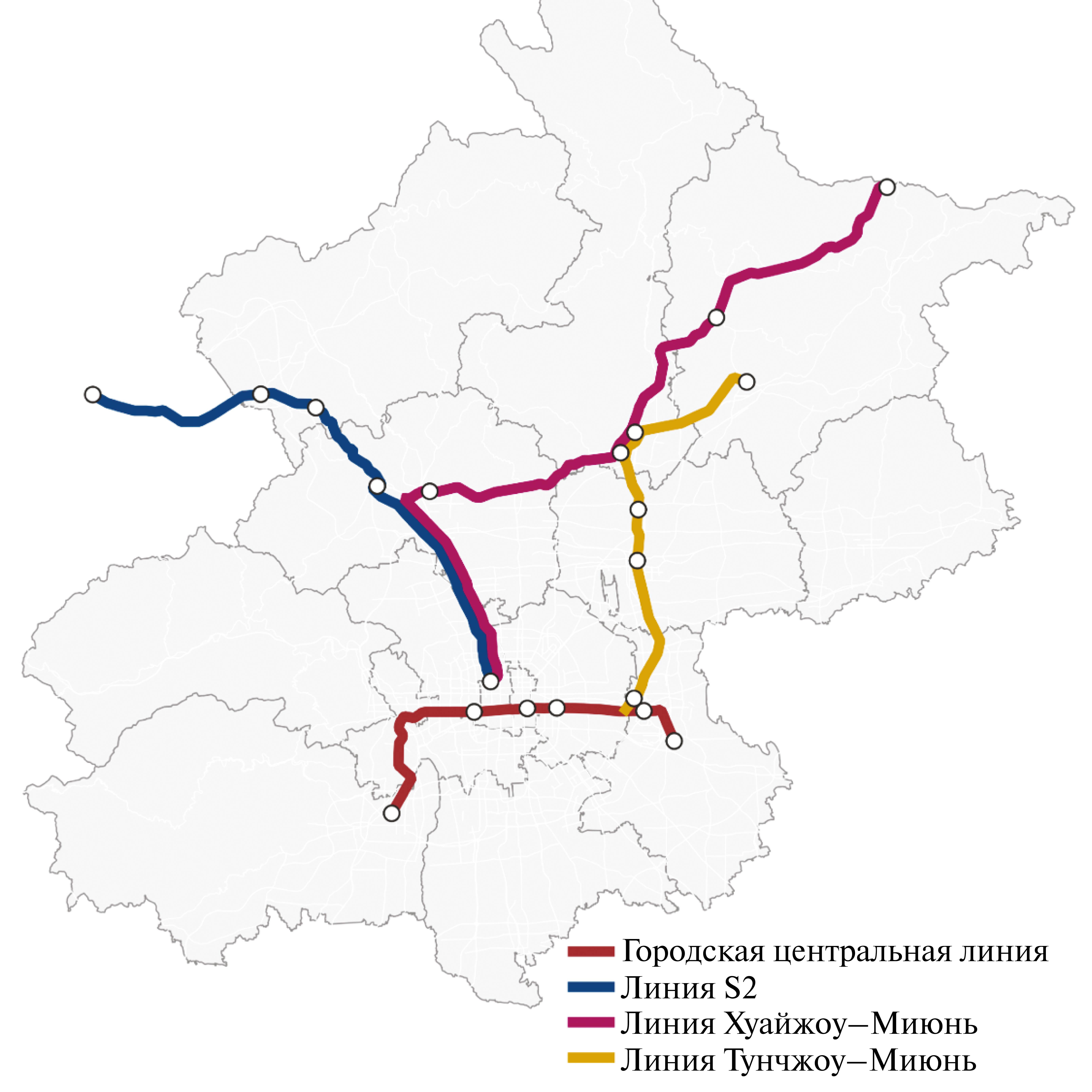 Рис. 5. Сеть пригородно-городских железных дорог Пекина охватывает всего несколько пригородных районов и городов-спутников в 2020 г. Составлено Н.Н. Беляевым по материалам автора.