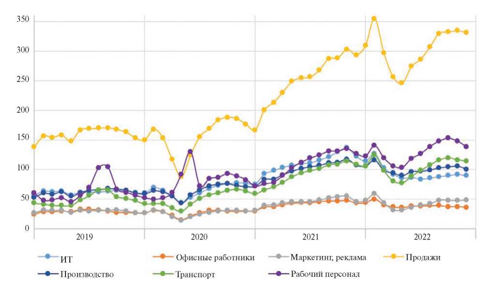 На динамике резюме произошедшие в начале 2020-х годов кризисы практически никак не отразились, здесь скорее проявляется влияние сезонных факторов. По резюме из особенностей отмечается значительное увеличение их количества в сфере IT в 2022 г., что связано с предоставлением льгот работникам этой области, появлением огромного количества различных экспресс курсов по программированию и очень высокими зарплатными ожиданиями, зачастую неоправданными, а также наличием брони от мобилизации в вооруженные силы. По итогу четырех лет количество резюме значительно увеличилось в сфере маркетинга и рекламы, а также среди рабочего персонала (на 44 и 30٪ соответственно). При этом среди высококвалифицированных работников промышленности, работников сферы транспорта и логистики и офисных работников наблюдается стагнация. Несколько более гибко вели себя резюме в сфере продаж: более заметное увеличение в 2020 и 2022 гг. на 11 и 16٪ соответственно.