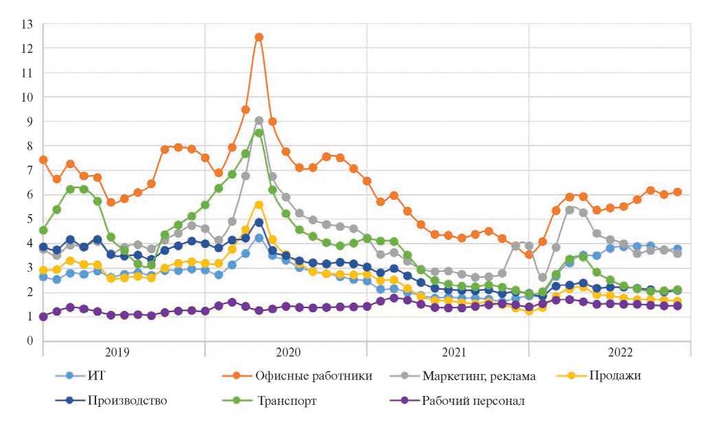 Дефицит рабочей силы. При изучении непосредственно дефицита рабочей силы также четко заметны два кризиса за счет резкого всплеска профицита (в мае 2020 г. и в мае 2022 г.). На графике также видно (рис. 4), что, несмотря на различные кризисные явления, складываются тренды роста дефицита рабочей силы (с 2019 г.) по большинству профессиональных областей. Лишь две профессиональные области – офисные работники и работники сферы IT – в 2022 г. стали более профицитными, чем в 2021 г. (см. рис. 4). И если в первом случае это объясняется некоторым уменьшением спроса (см. рис. 2), то в случае с IT это объясняется и уменьшением спроса, и значительным увеличением количества предложений по изложенным причинам.