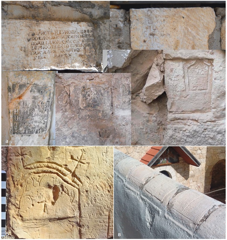 Ил. 1. Памятные таблички православных паломников в Иерусалиме, XVIII–XIX вв. (Архангельский монастырь в Старом городе, съёмка 2018 г.): а — коллаж на основе фотографий Экспедиции; б — граффити паломника с условным изображением Гроба Господня; в — таблички на парапете галереи с кириллическими надписями XIX в.