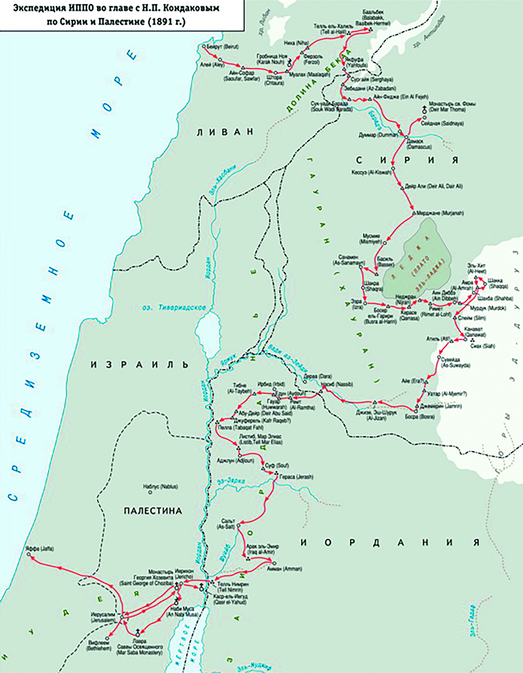 Ил. 7. Первая детальная схема маршрута экспедиции ИППО под руководством Н.П. Кондакова 1891 г. Разработана А.А. Астайкиным и М.Н. Бутырским в рамках комментирования материалов экспедиции (см.: Путевой дневник Н.П. Кондакова по Сирии и Палестине... 2021)