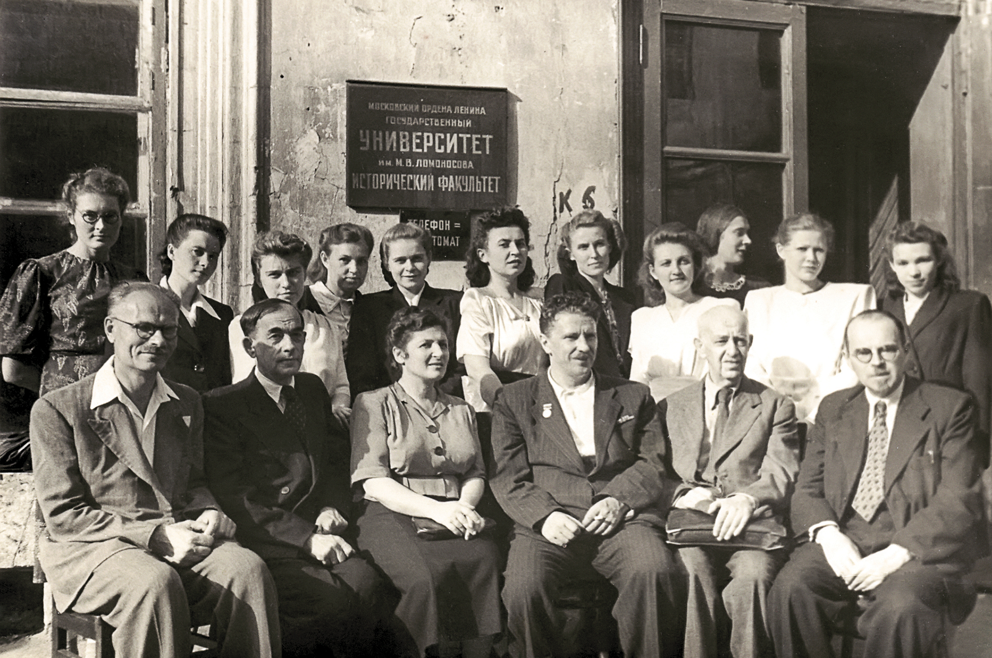 Ил. 2. Выпускники кафедры этнографии МГУ. Профессора (сидят, слева направо) С.А. Токарев, Е.М. Шиллинг, С.П. Толстов, М.О. Косвен, Н.Н. Чебоксаров среди студентов (стоят: Т. Трофимова, Л.В. Покровская, Л.Н. Чижикова). 1949 г.